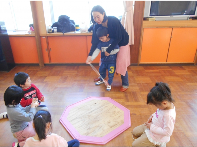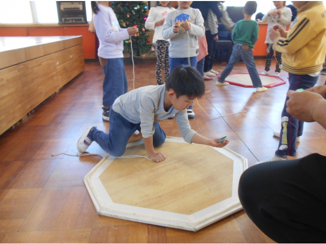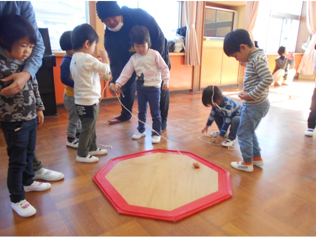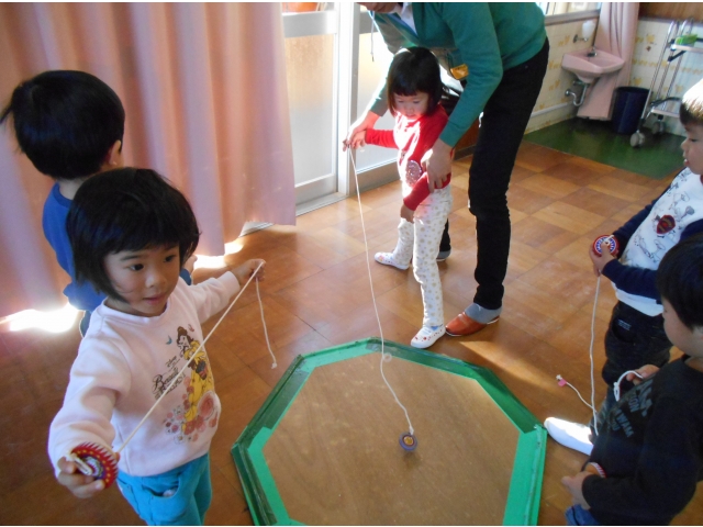 今年も、学童の指導員をしている保護者の方のご厚意で幼児クラスの子どもたちにこまの回し方を教えていただくこま大会を行いました。