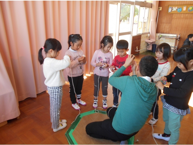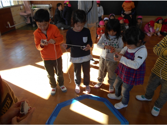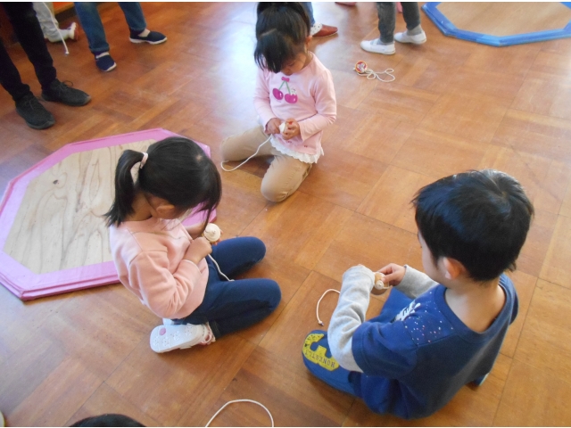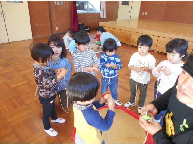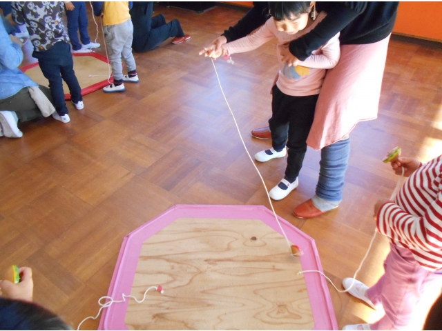 最後は5歳児。自分の木ゴマで教えてもらいます。ひもを巻くのは難しかったけれど自分で巻けるよう頑張りました。自分で回せる子は手のせの技も教えてもらいました。