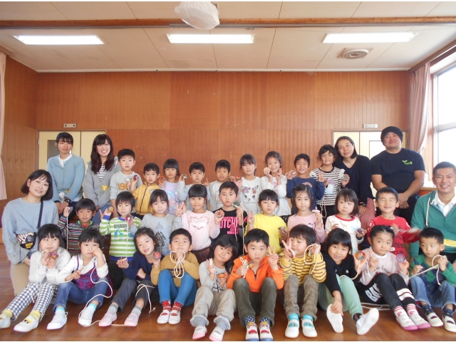 次は4歳児。4歳児は自分の缶ゴマをまわします。ひもの巻き方も教えてもらいますが、それが難しい。でも頑張りました。