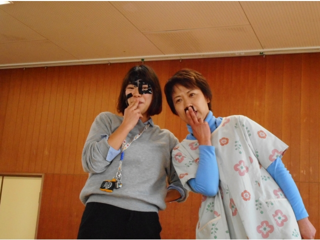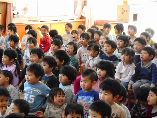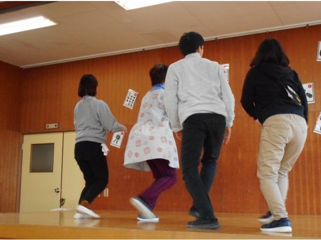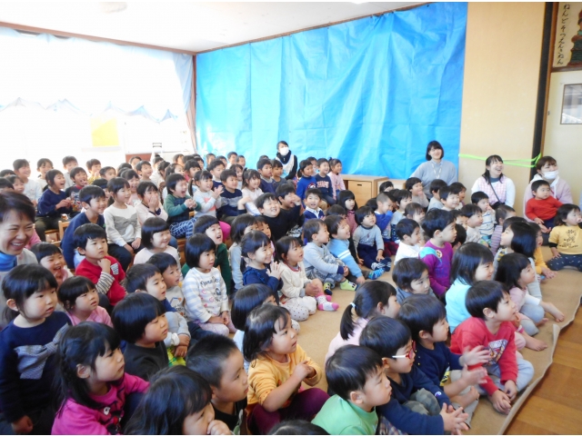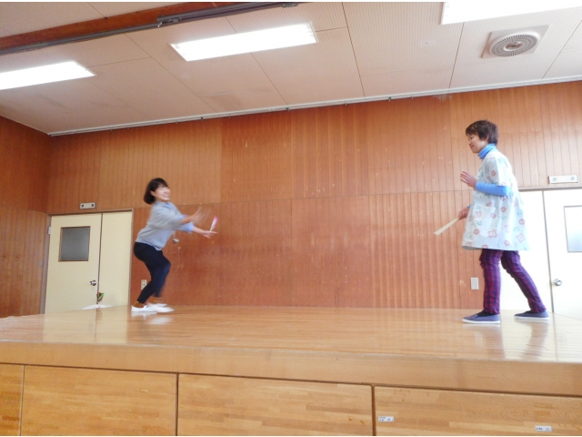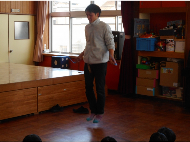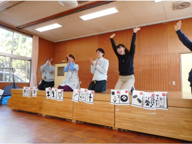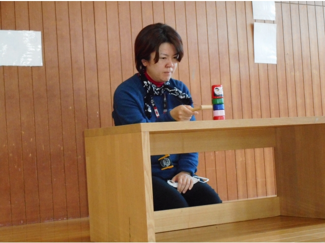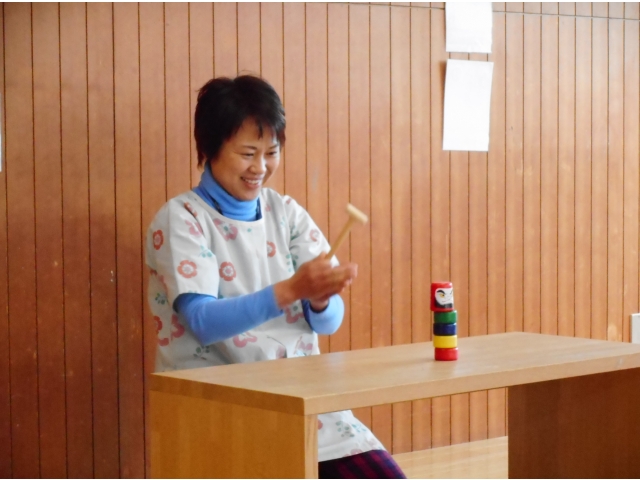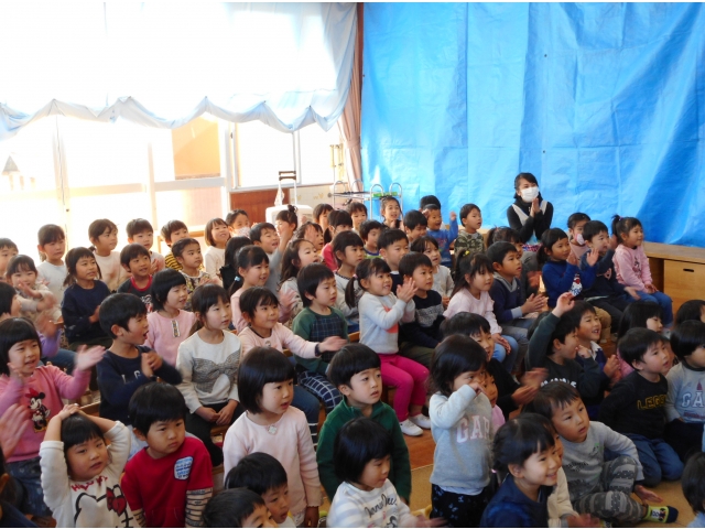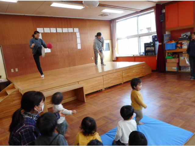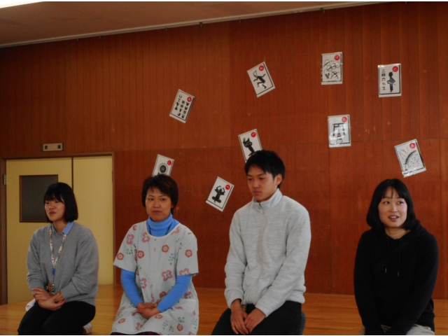 遊戯室にみんなが集まり、職員が披露する正月あそびを楽しみました。