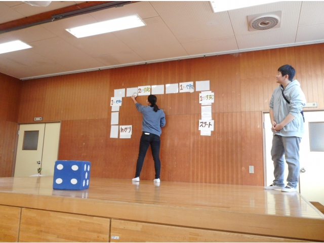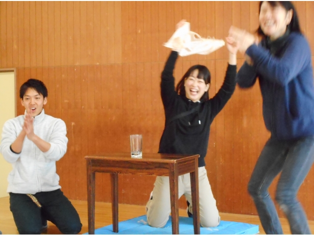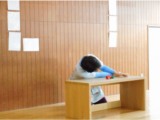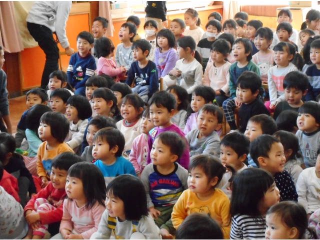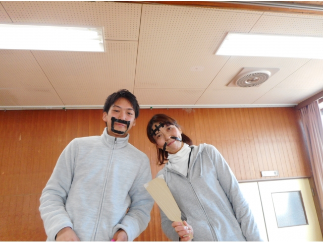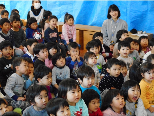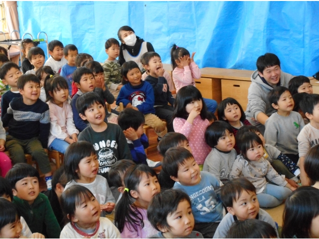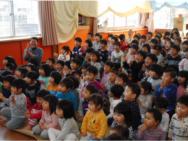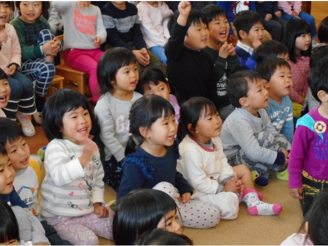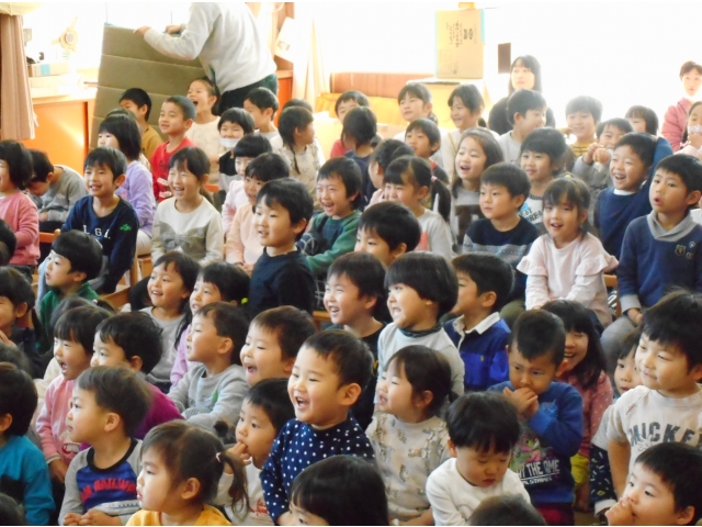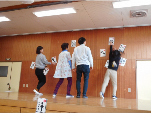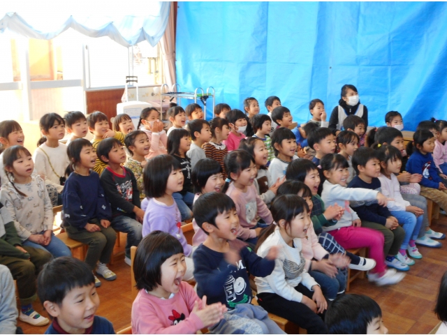 遊戯室にみんなが集まり、職員が披露する正月あそびを楽しみました。