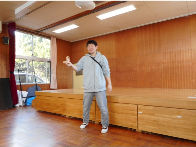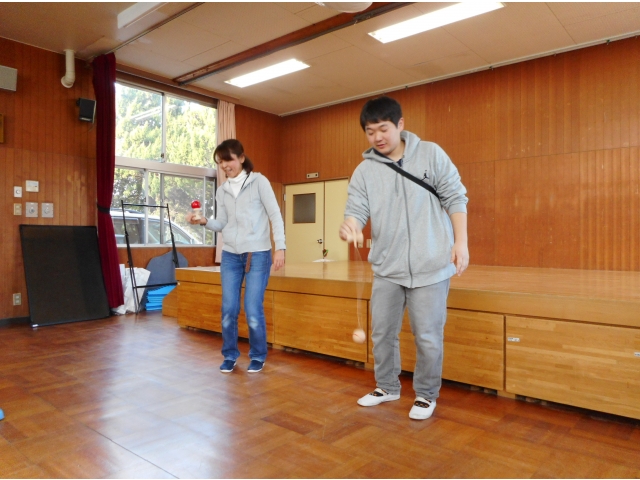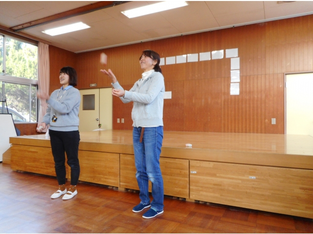 まりつきにお手玉。職員のかくし芸のなわとびとクロス引きも披露します。