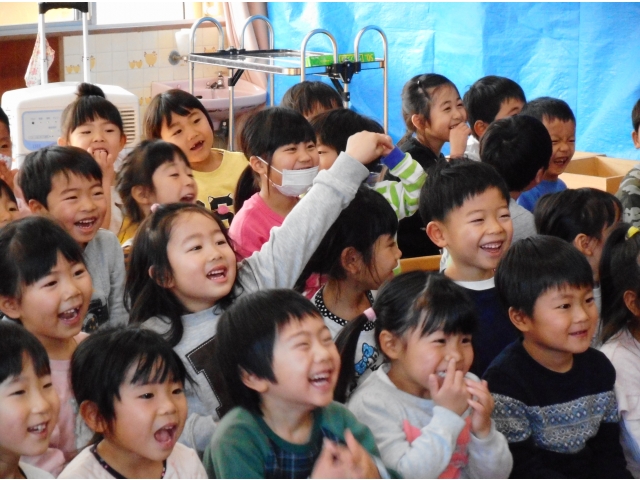 職員の姿を見て子どもたちは応援したり、大笑いしたり。
