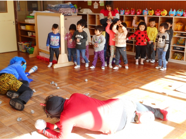幼児クラスは、本物!?のオニが来て、自分の中にある“いやいやオニ”“おこりんぼうオニ“いじわるオニ”“なきむしオニ”…をみんなで追い出しました。