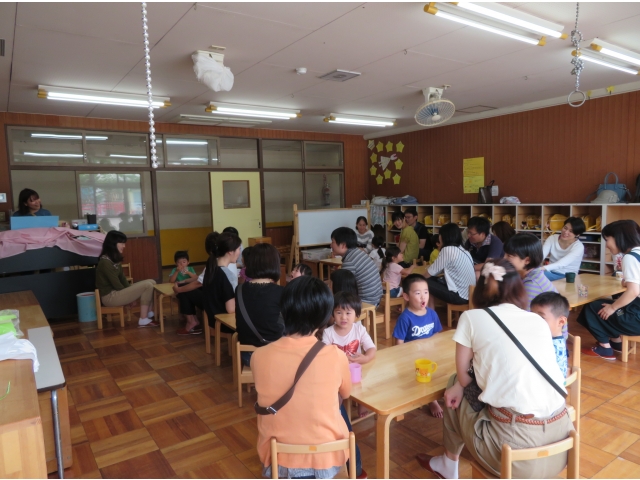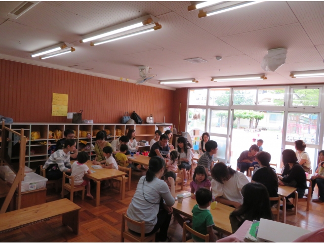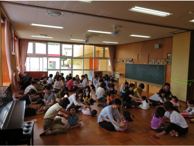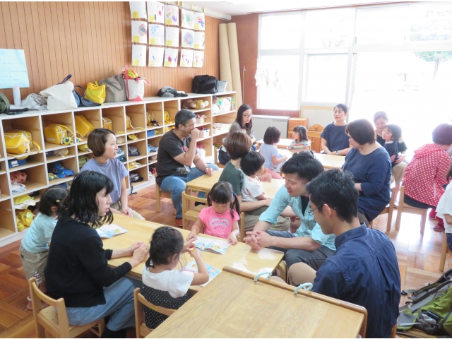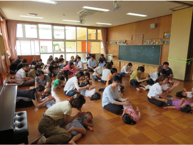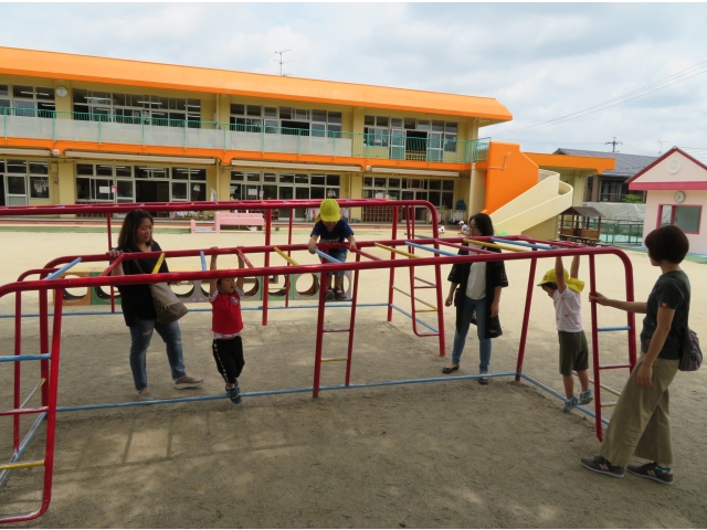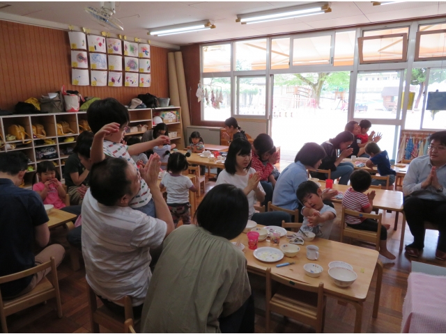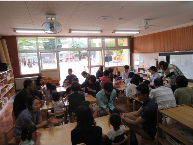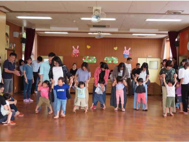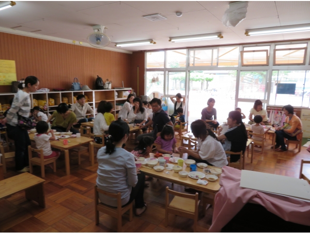 朝からお父さん、お母さんを好きな遊具へ誘い一緒に遊んだり、ふれあい遊びをしたり、給食を食べたりし、親子で楽しい時間を過ごしました。