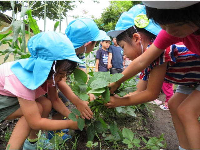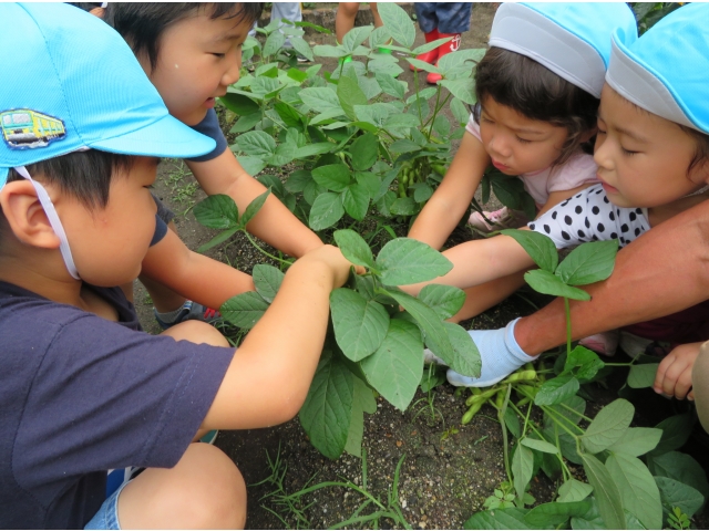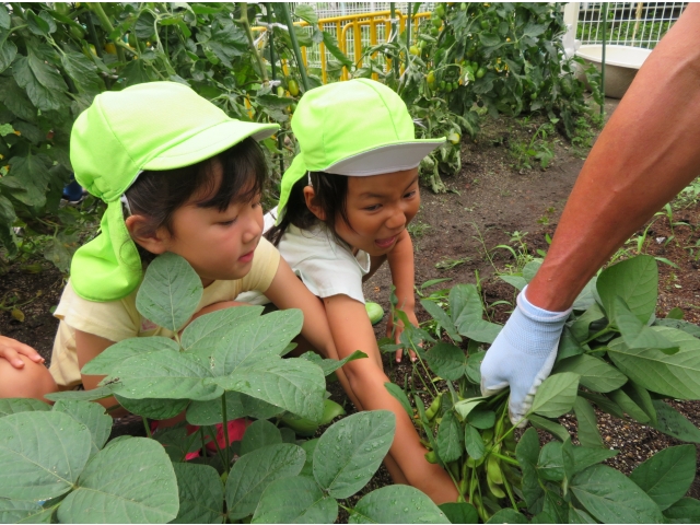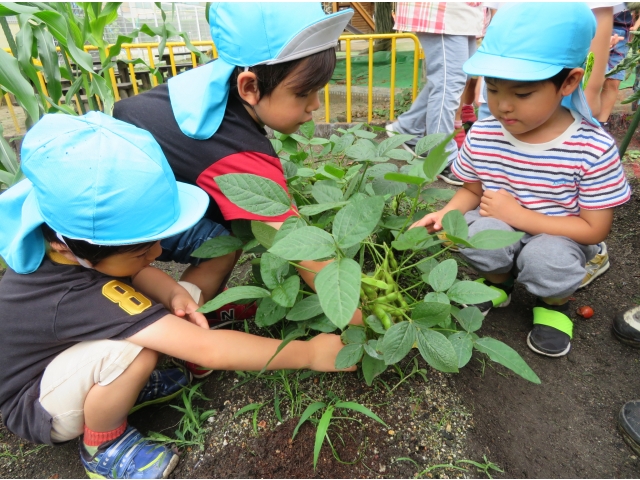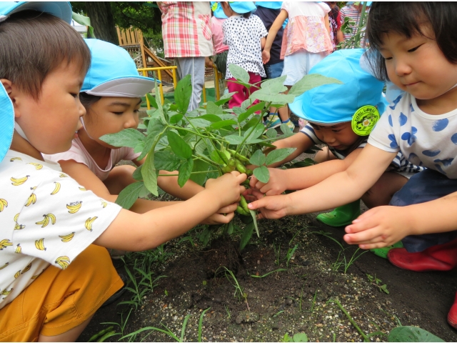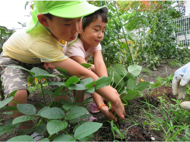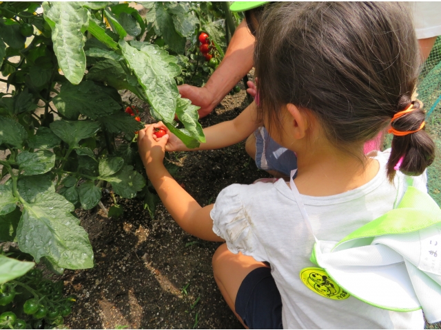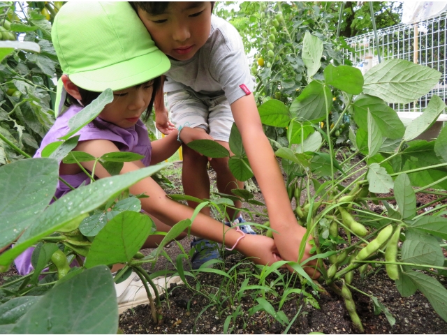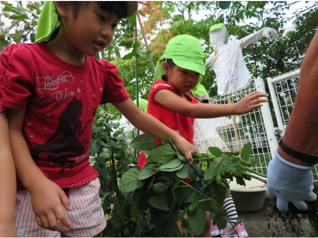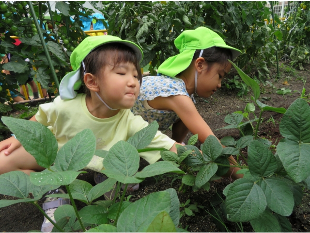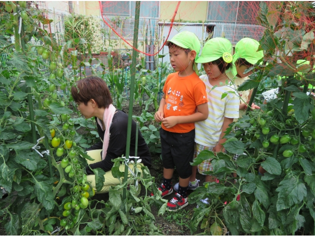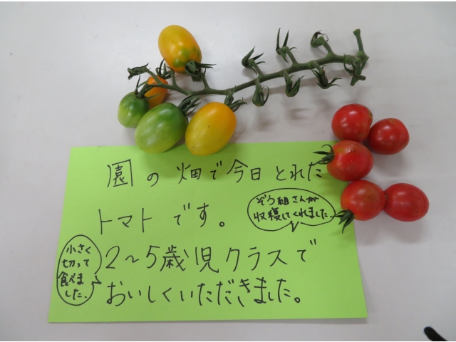 トマトはたくさん収穫できたので、2・3歳児さんにもおすそ分けしました。枝豆はゆでてもらって食べ、「おいしい!」と大喜びでした。自分たちで育てたお野菜は格別のようです!