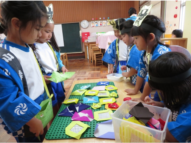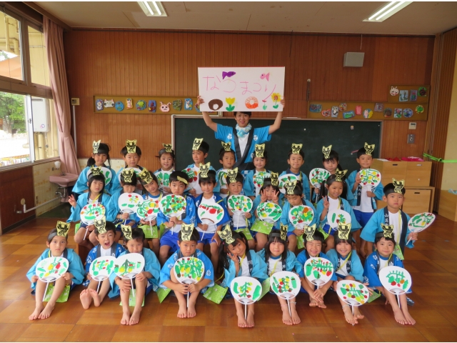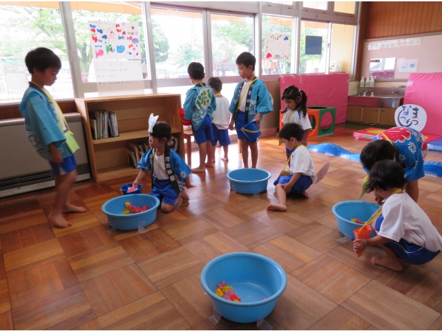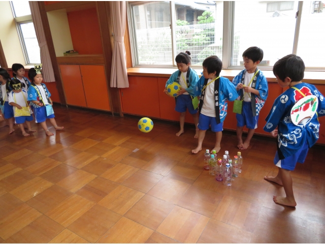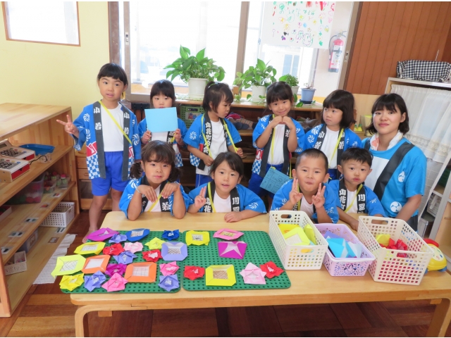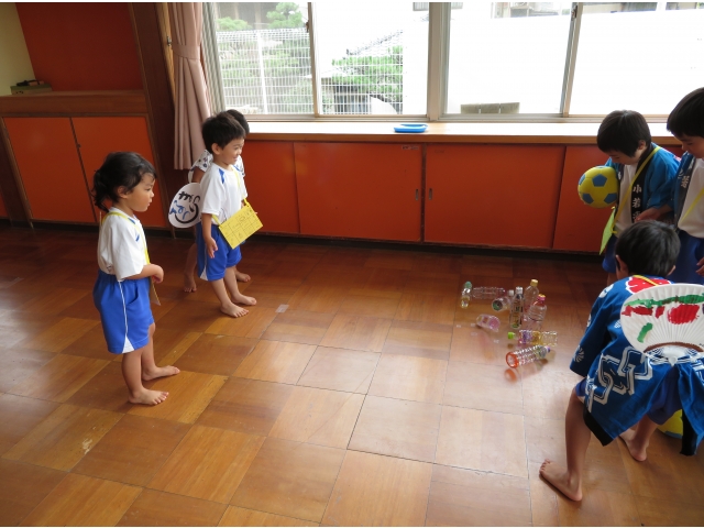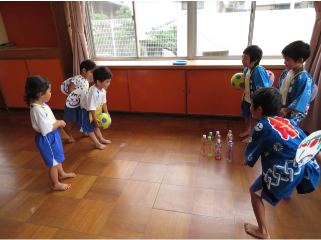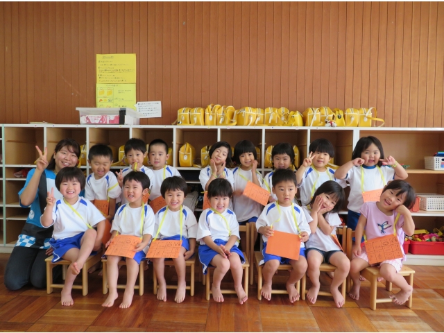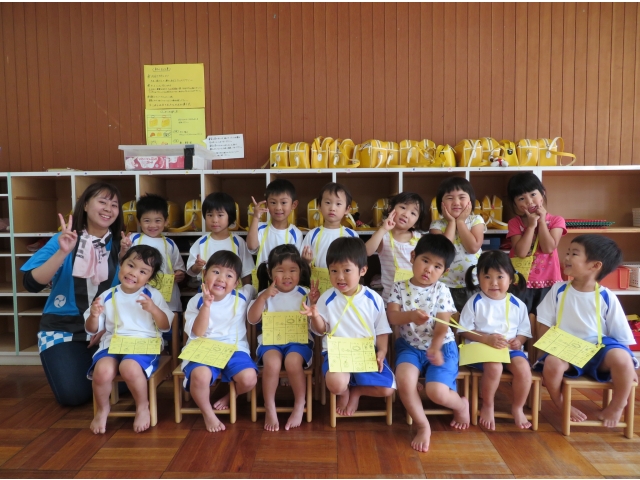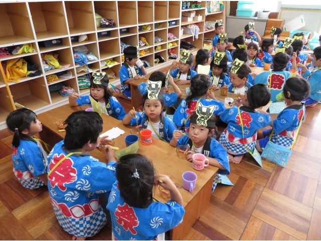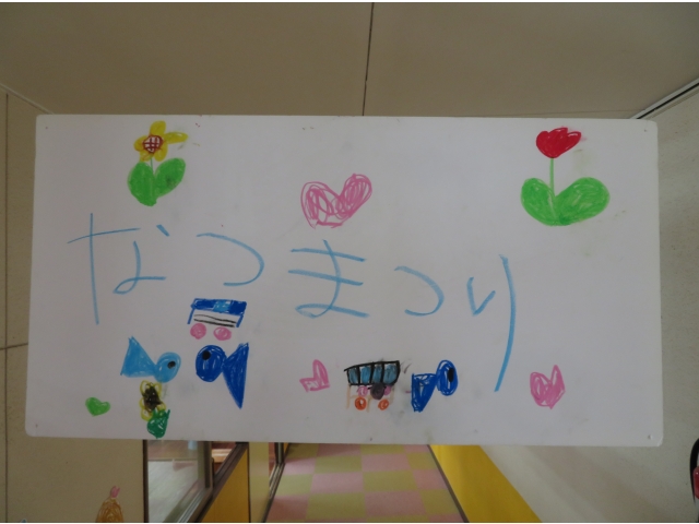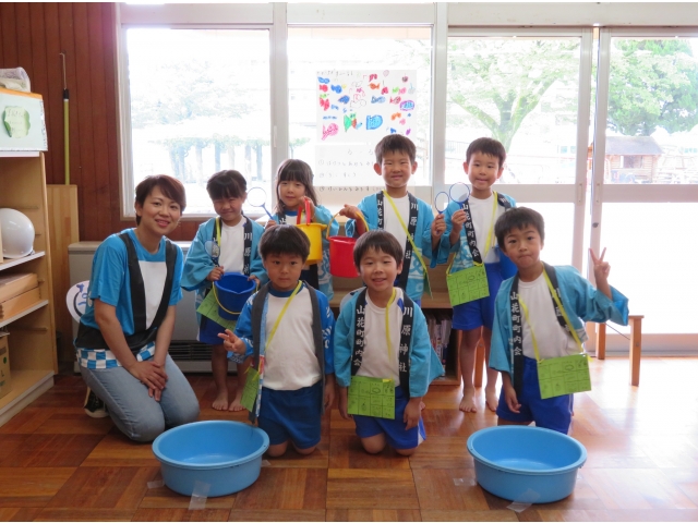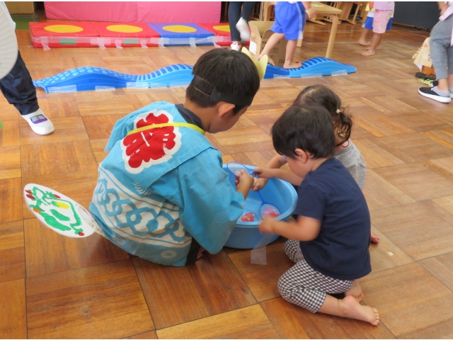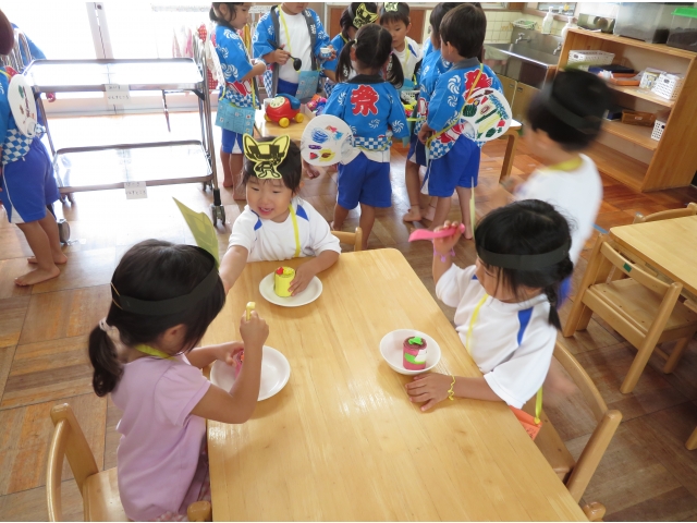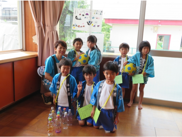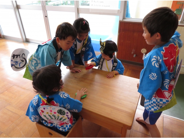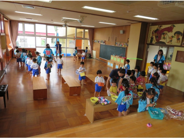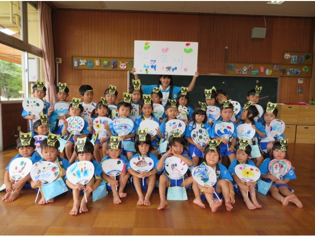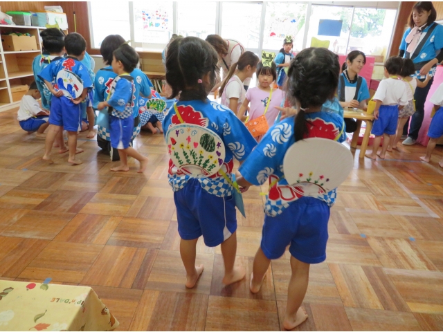 幼児クラスの子どもたちは自分で描いたうちわを持って参加です。