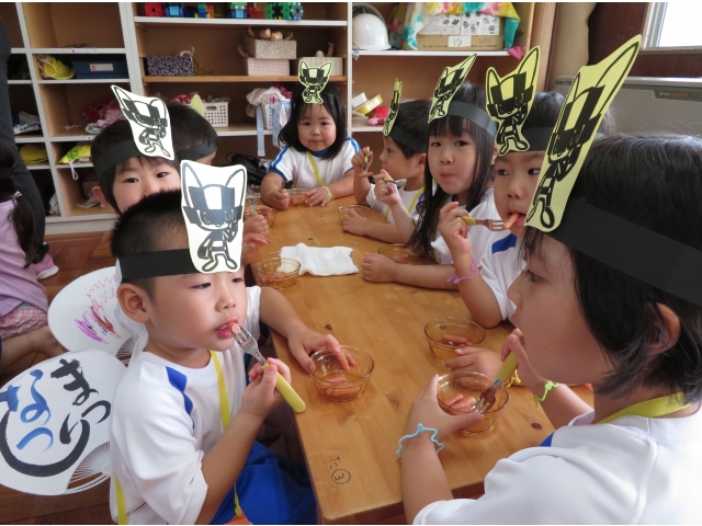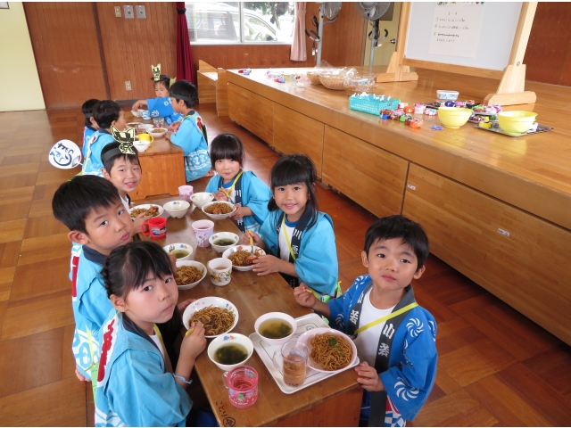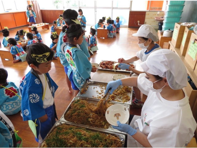 今日の給食は、給食の先生のお店で焼きそばを買います。