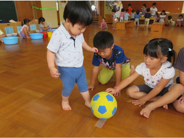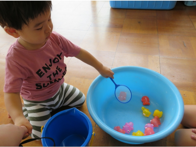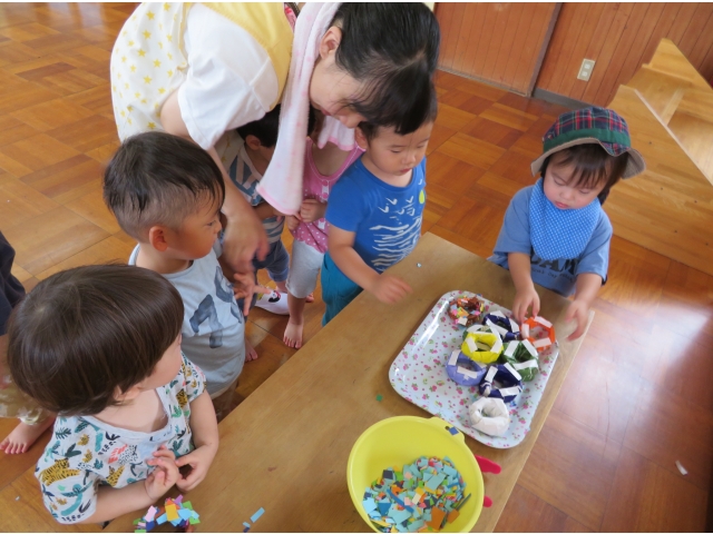 なつまつりの日は参加しなかった1歳児のうさぎ組とりす組を4・5歳児の子どもたちが招待してくれて、1歳児だけのなつまつりが開催されました。
