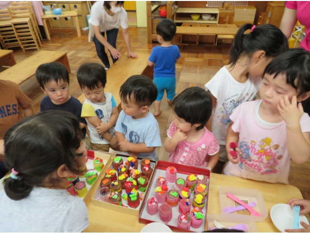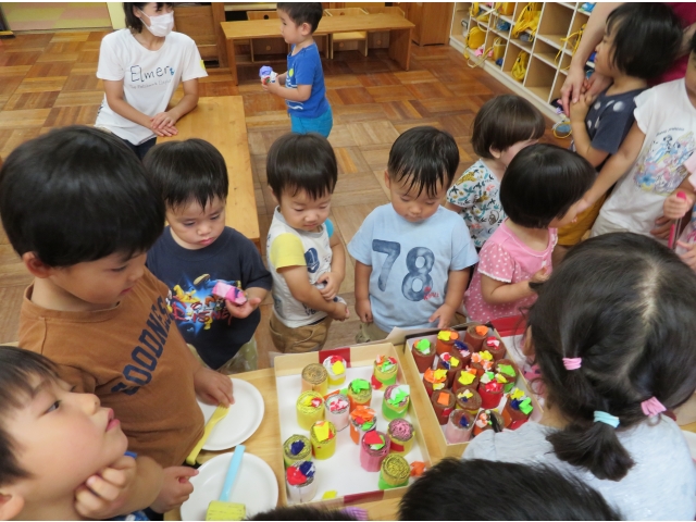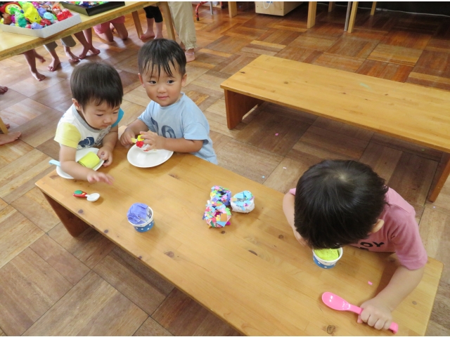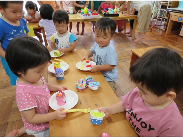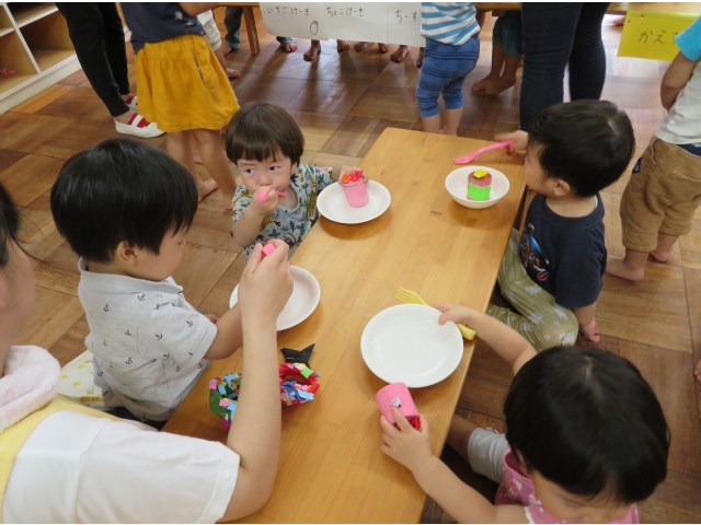 4歳児のお店はケーキとアイス。食べ物はわかりやすく、大喜びの1歳児。ほしいものに手を伸ばしたり、おいしそうに食べたりと楽しんでいました。