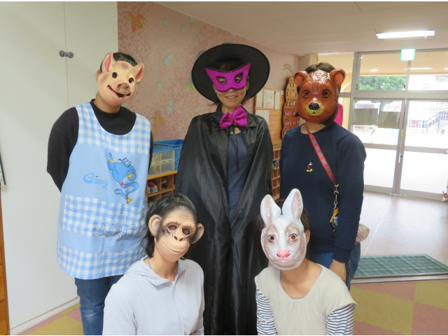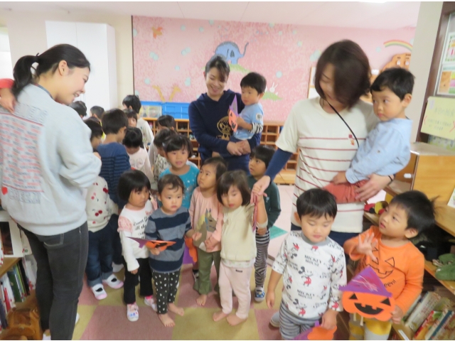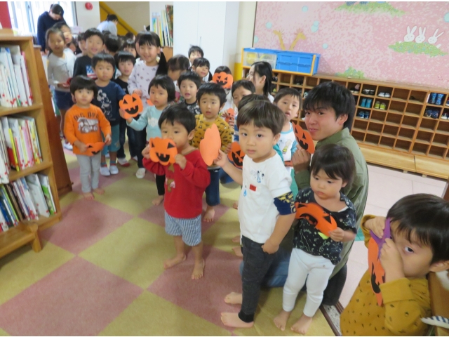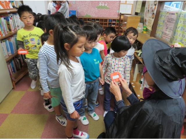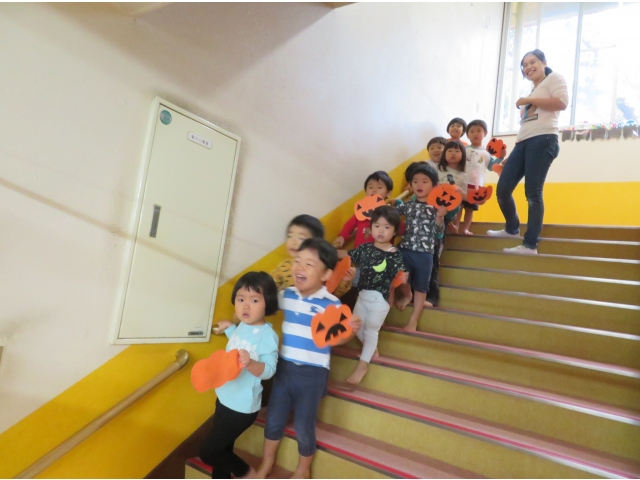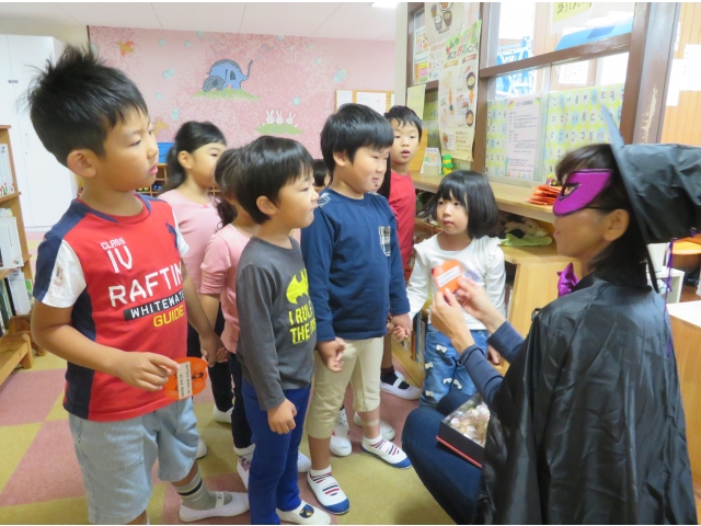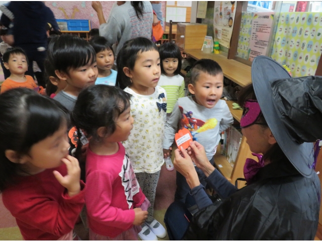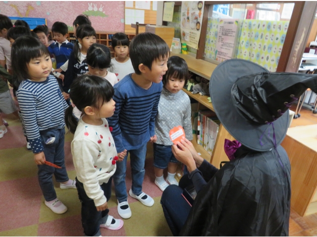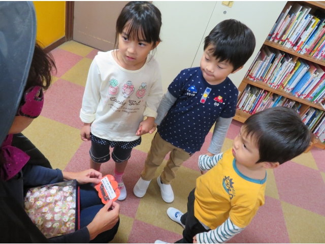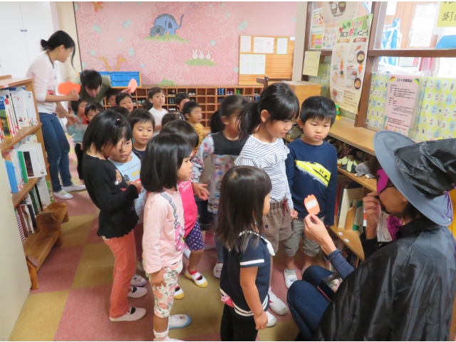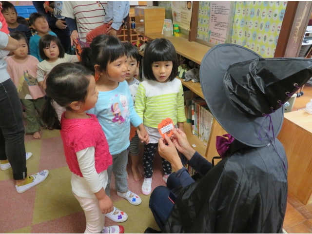 3.4.5歳児で3人のグループになり、クイズの書いてあるかぼちゃのカードを探し、それを持って魔女の所へ。さて、クイズに答えられるかな?