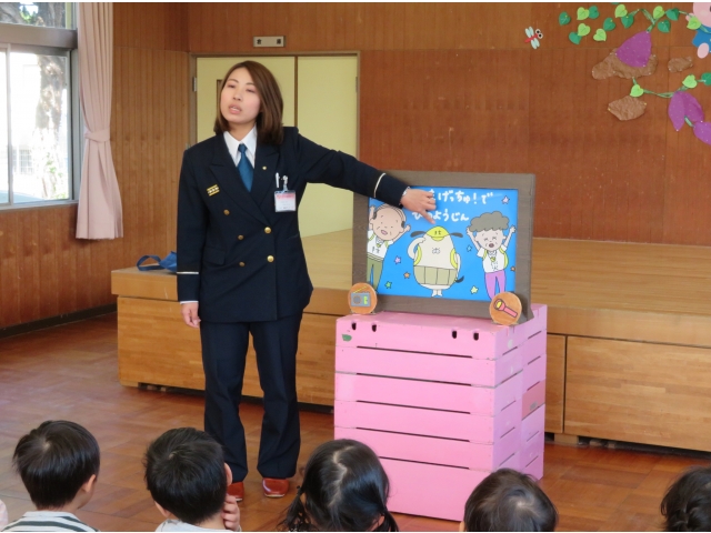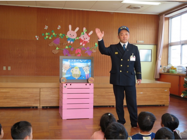 たまごろうというキャラクターが、火事の予防や消火をする内容です。たまごろうはびっくりすると「おったまげっちゅ!」と言います。子どもたちも教えてもらい、たまごろうと一緒に「おったまげっちゅ!」と言っていました。