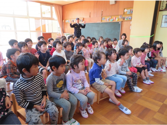 昭和消防署の消防士さん2人が遊戯室で紙芝居をみせてくれました。夏におもちゃ花火に来てくれた消防士さんを覚えていて、最初から大喜びの子どもたちです。