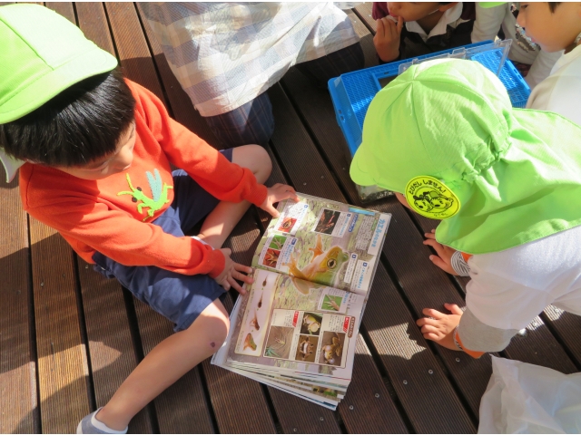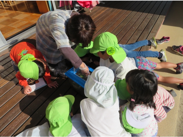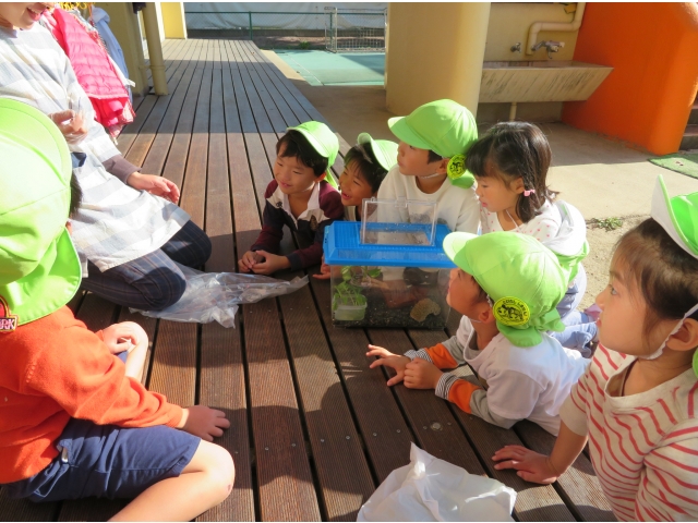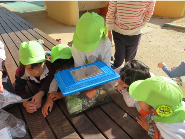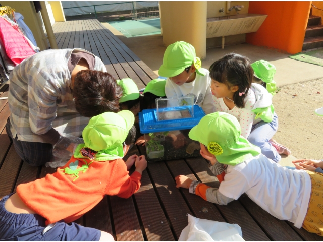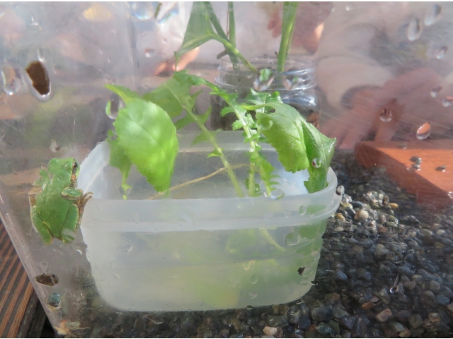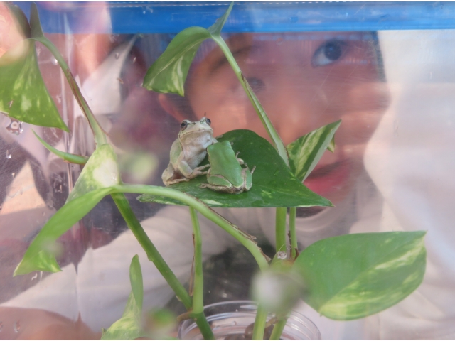 お弁当を食べ、グランドで遊ばせてもらいましたが、その時にカエルを発見!どうしてもと言うので、4匹持ち帰り年長さんが育てています。
