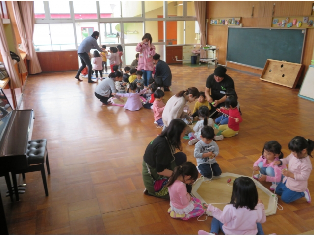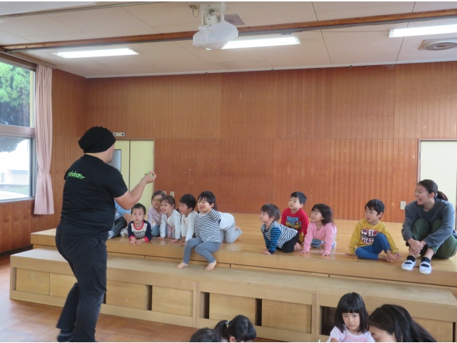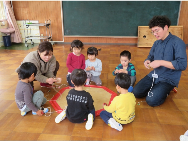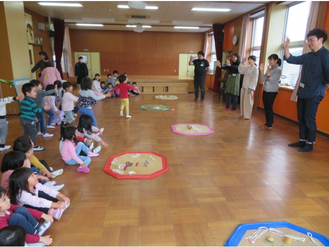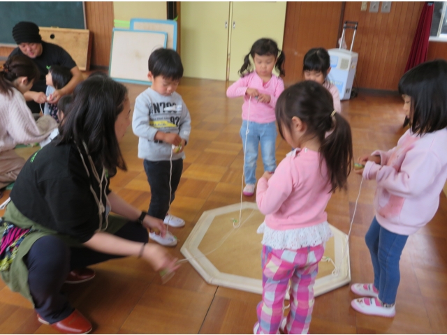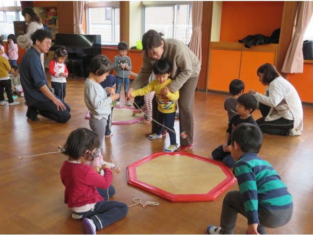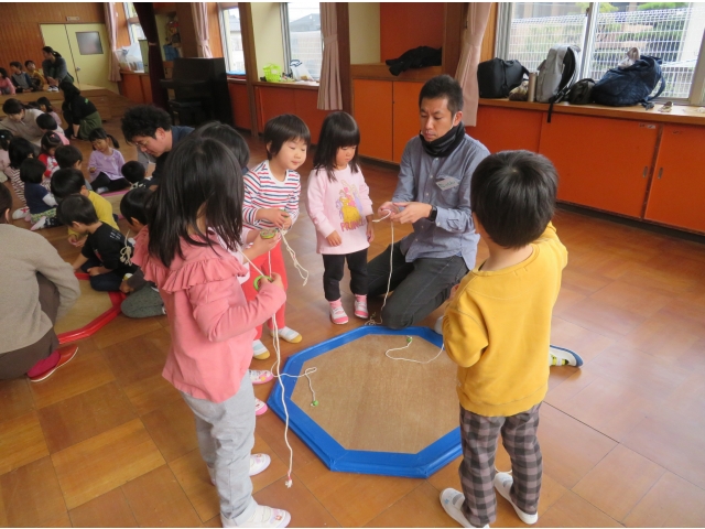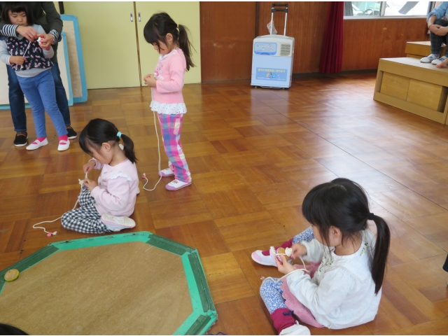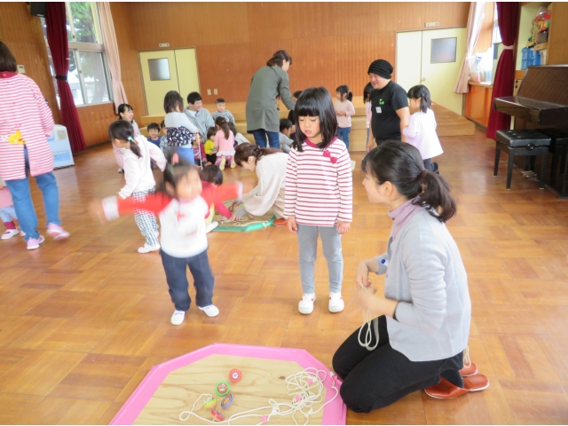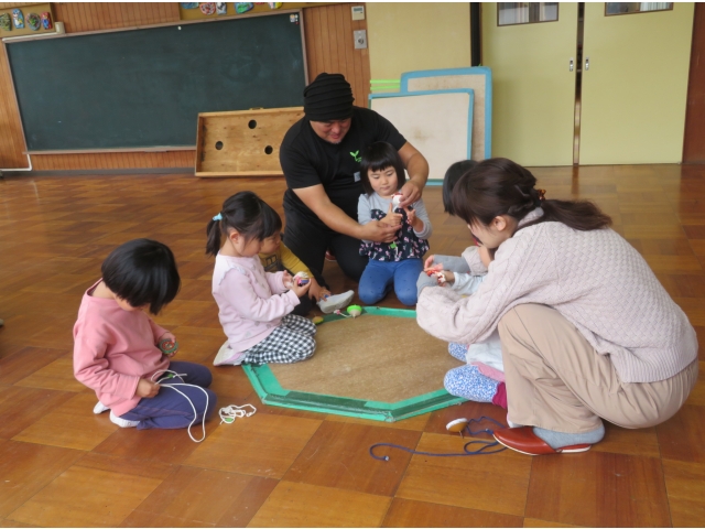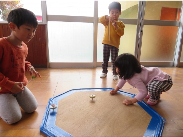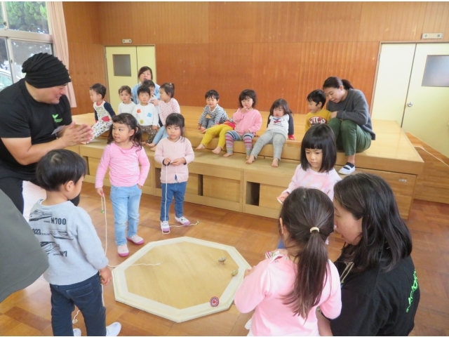学童の指導員の方が、こま回しの仕方を教えに来園してくれました。