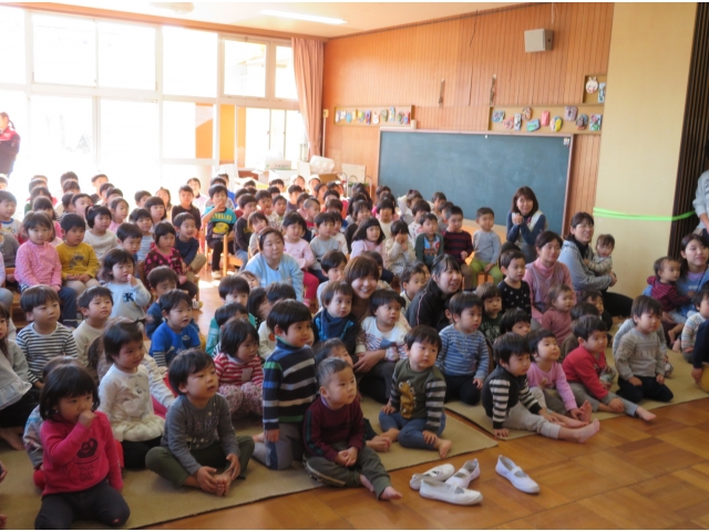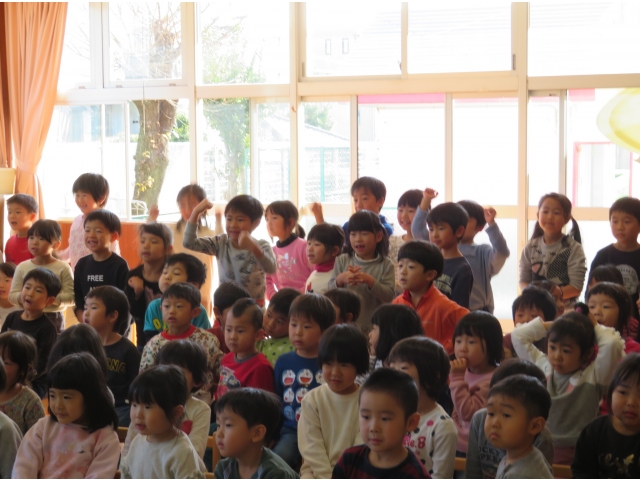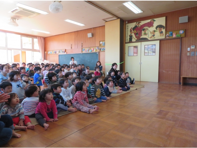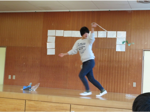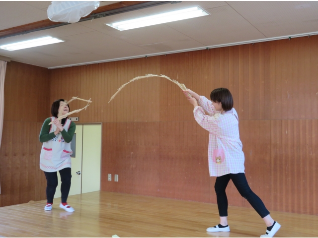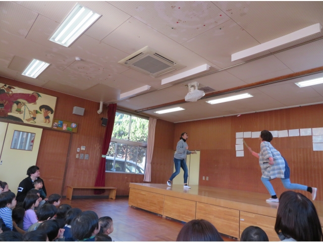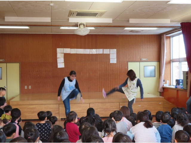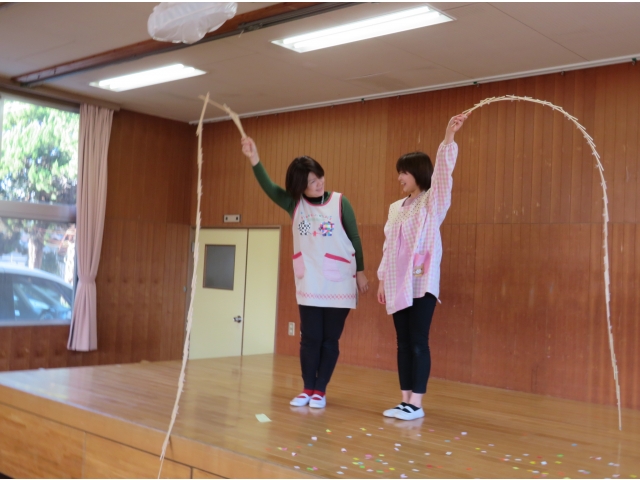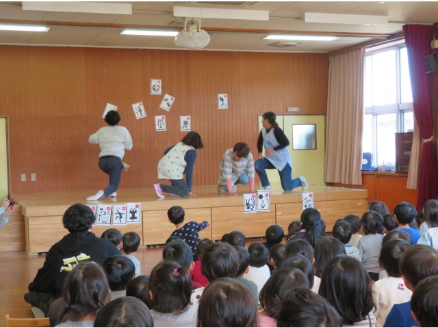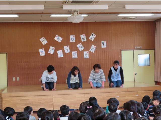 正月に昔の人はどんなあそびをして過ごしていたかを、密かに練習を重ねた職員が、子どもたちに紹介しました。