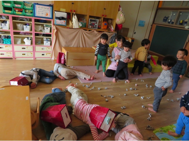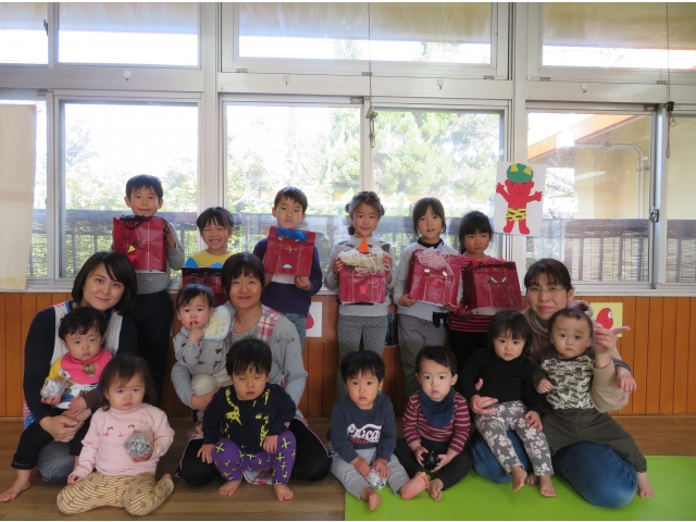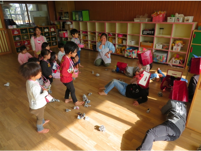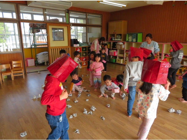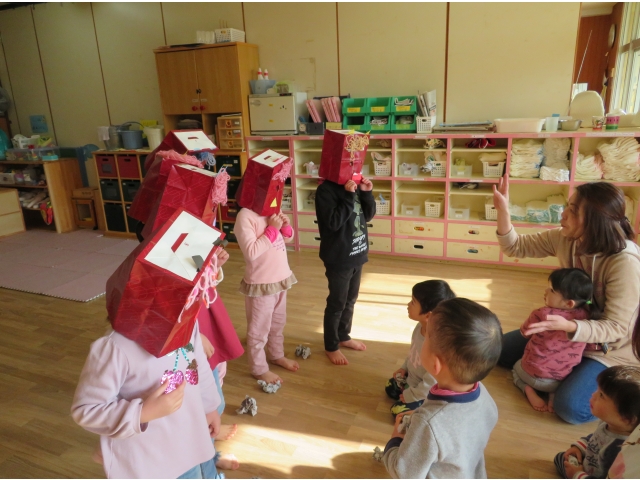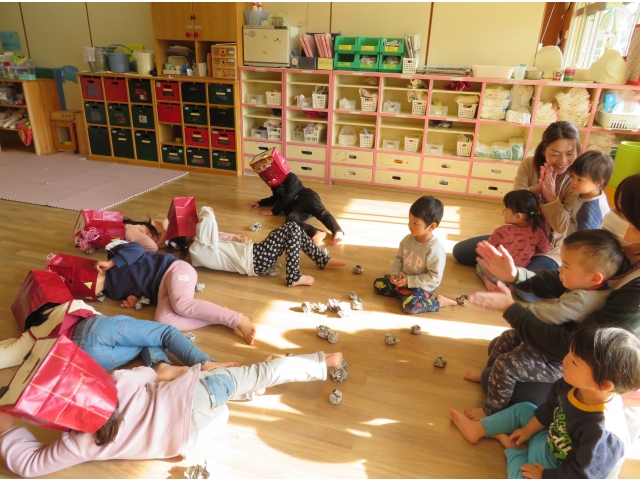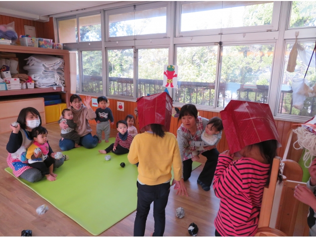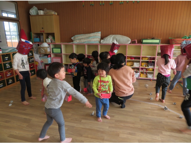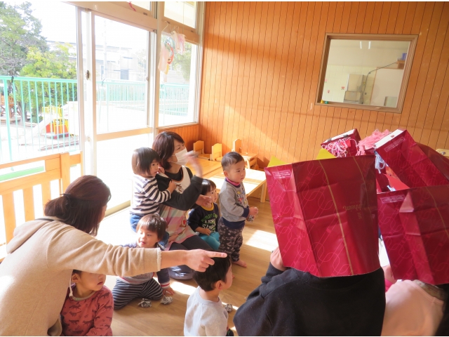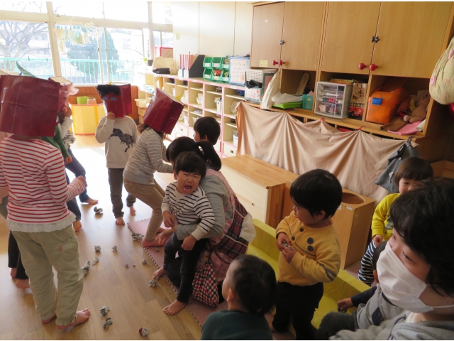 節分の日に、5歳児のお友だちがオニになって乳児の部屋へきてくれました。