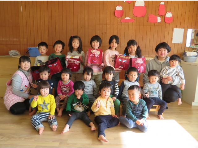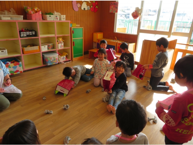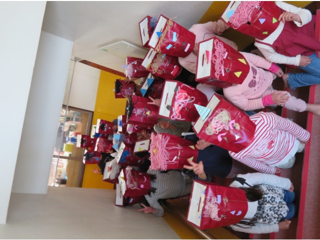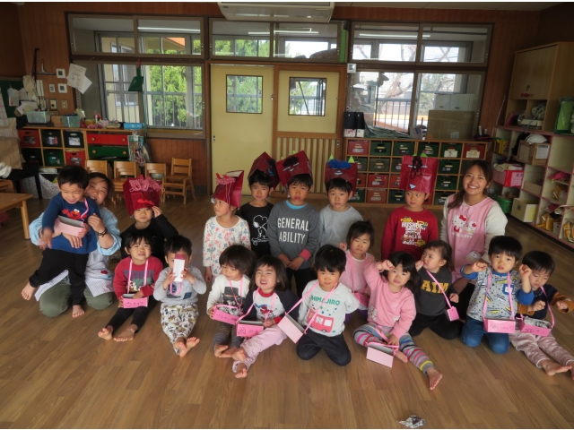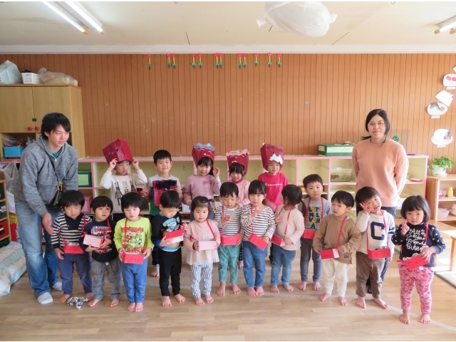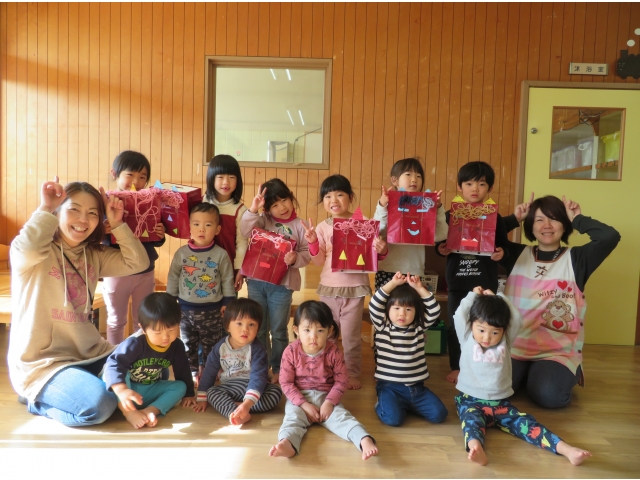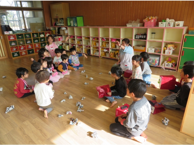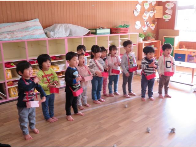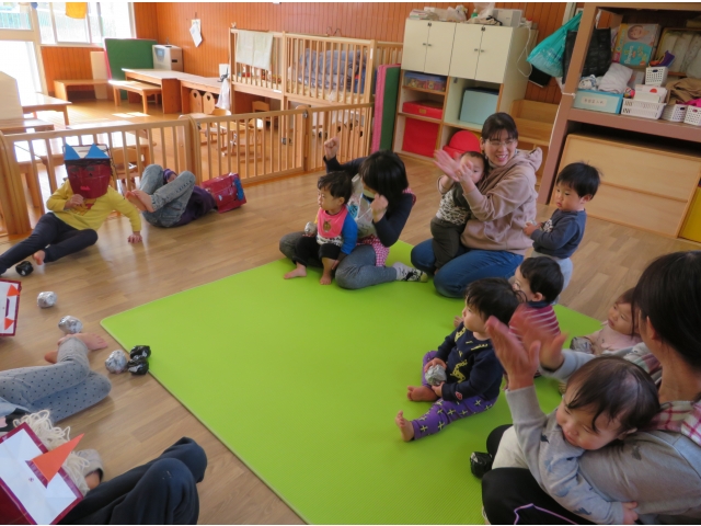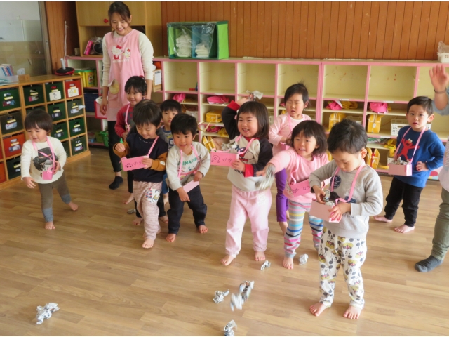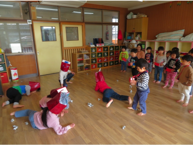 節分の日に、5歳児のお友だちがオニになって乳児の部屋へきてくれました。