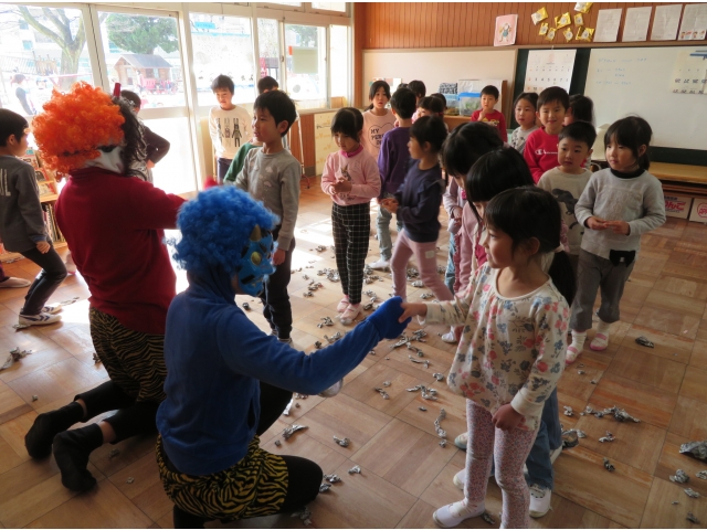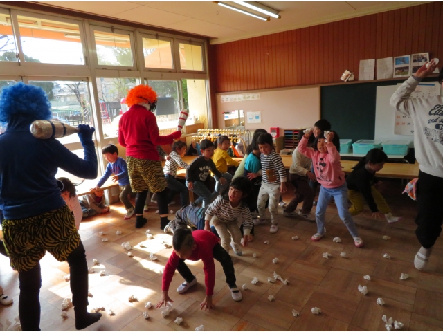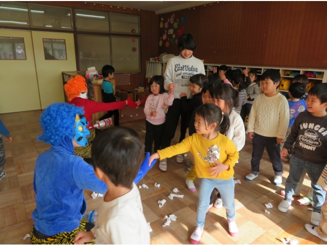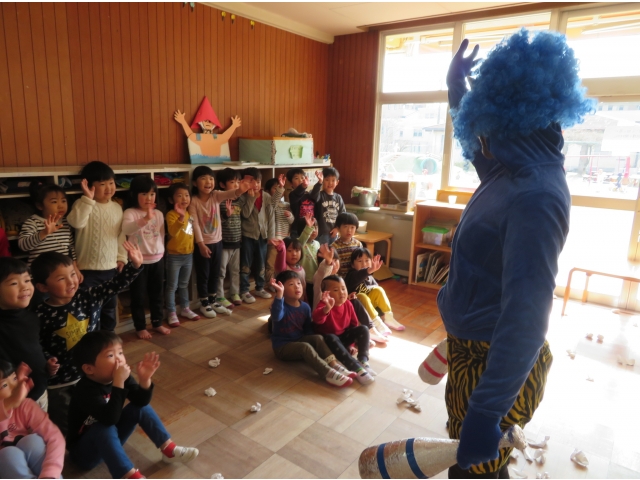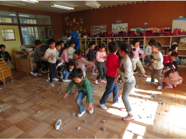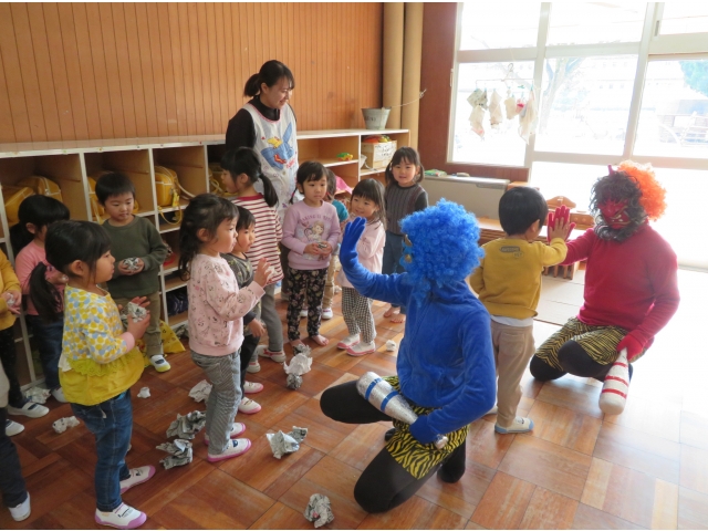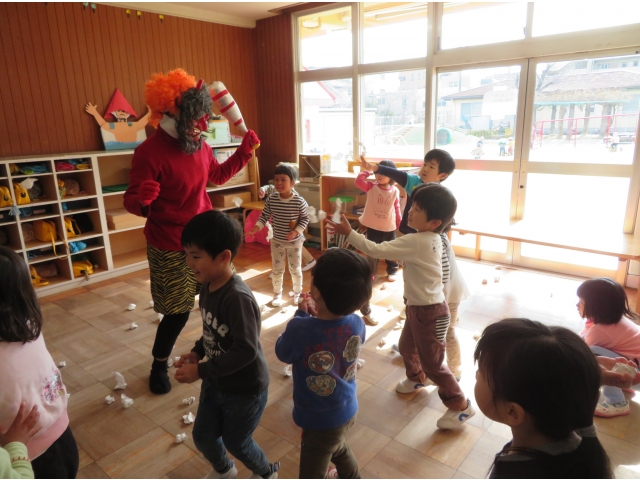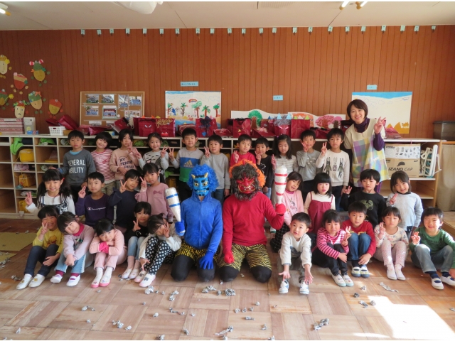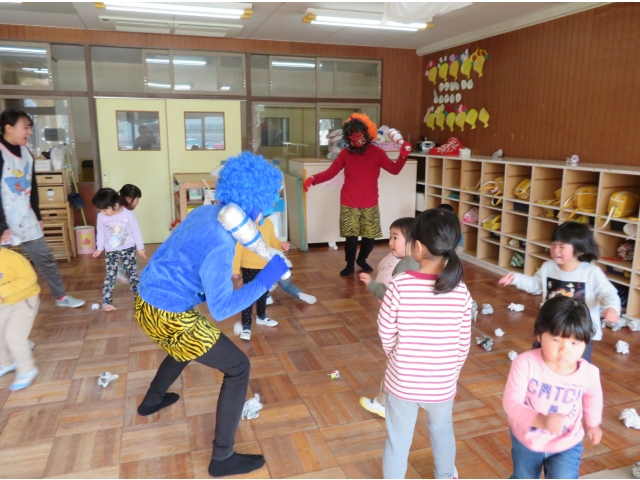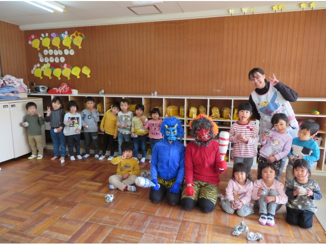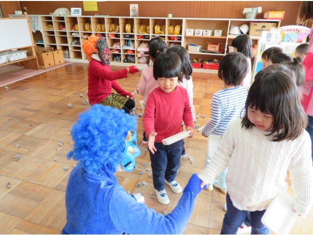 自分の中にいる“おこりんぼうオニ”“なきむしオニ”“いじわるオニ”“いやいやオニ”などいろいろなオニを追い出してもらうため、今年もあかオニ、あおオニが保育園へきました!