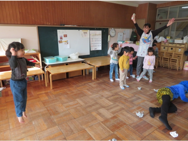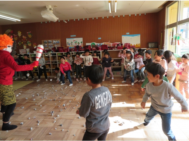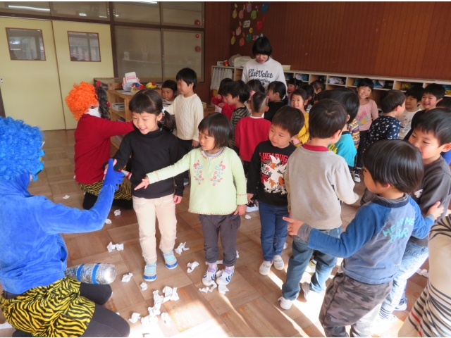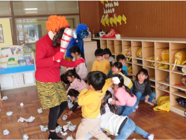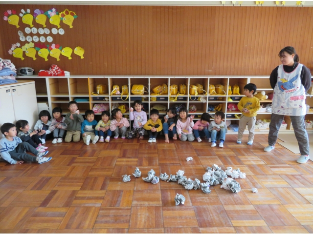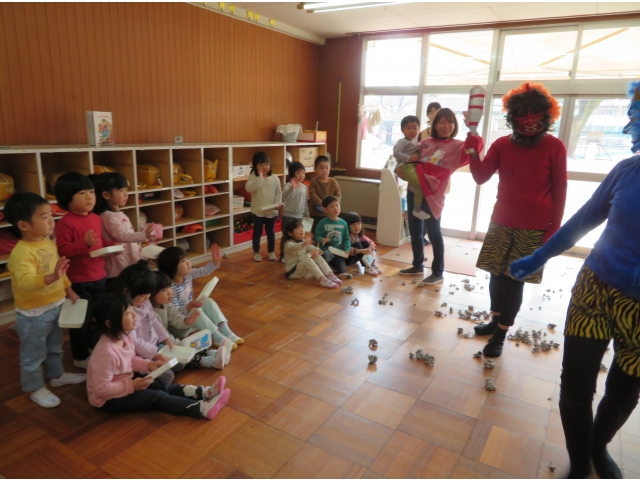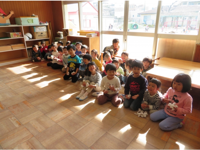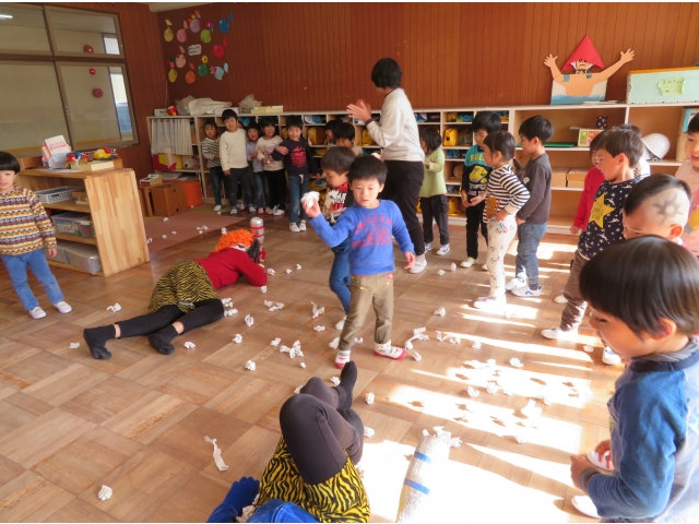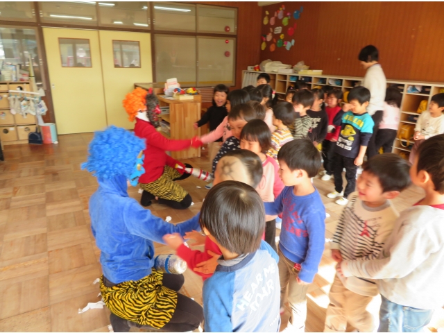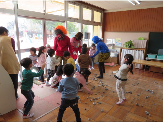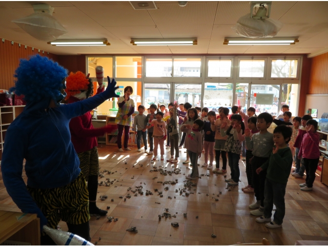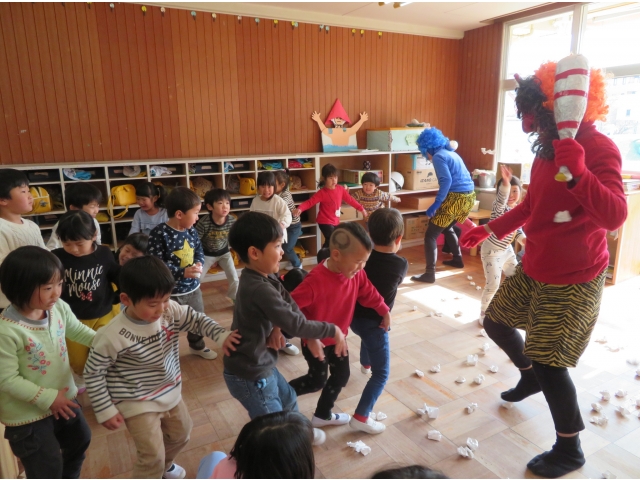 自分の中にいる“おこりんぼうオニ”“なきむしオニ”“いじわるオニ”“いやいやオニ”などいろいろなオニを追い出してもらうため、今年もあかオニ、あおオニが保育園へきました!