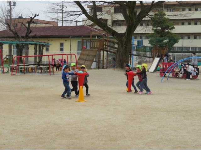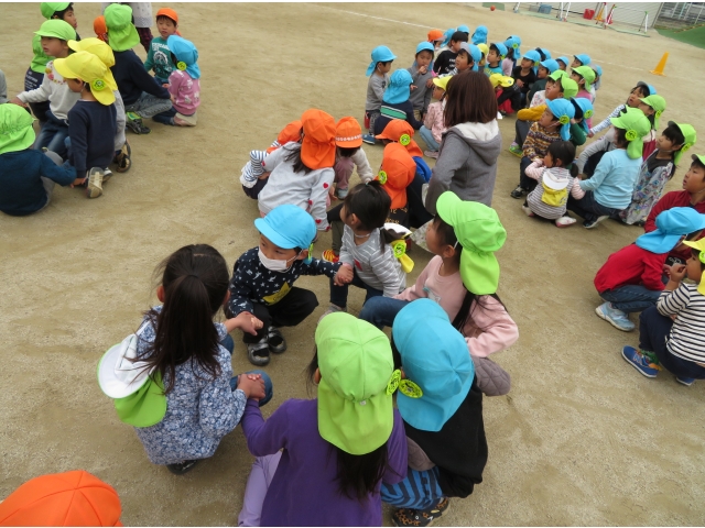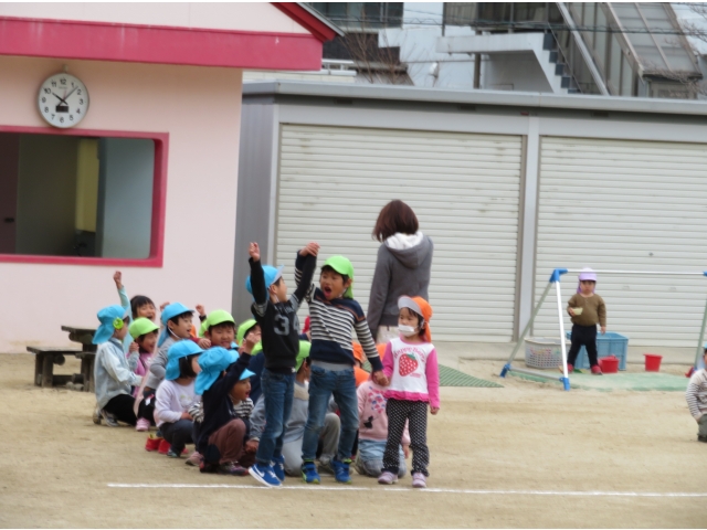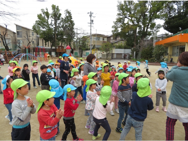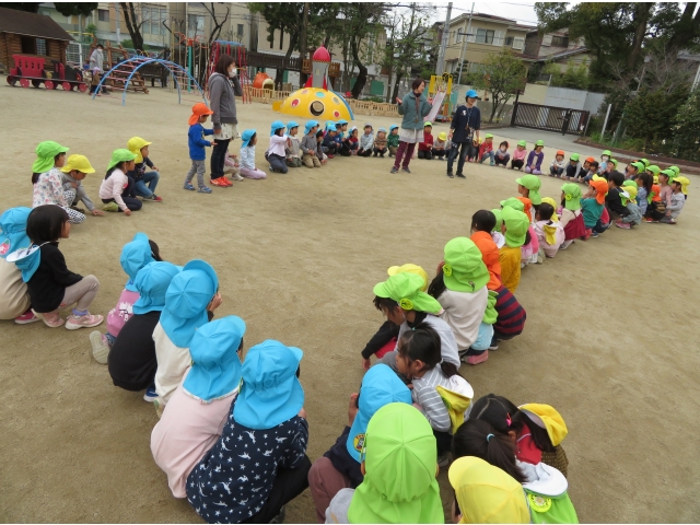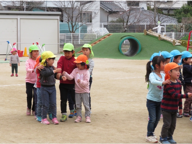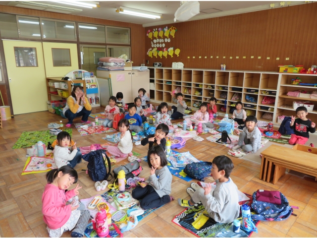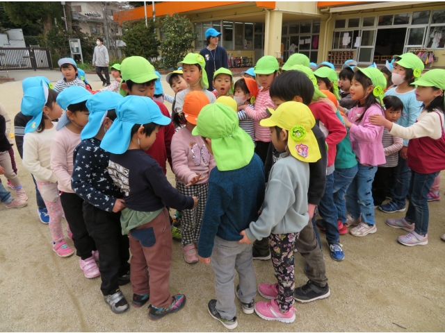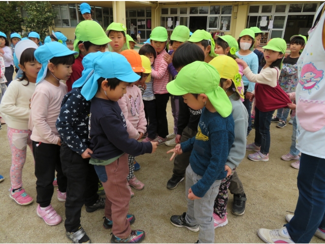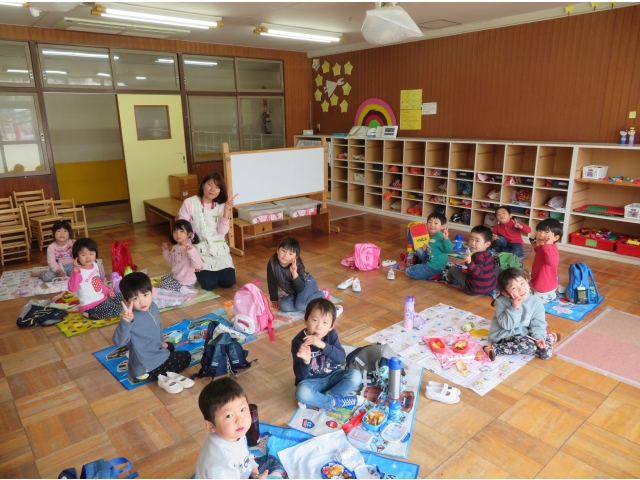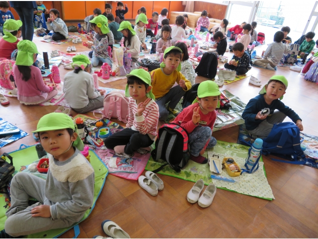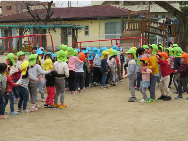 お弁当を持ってお別れ遠足へ行く予定でしたが、新型コロナウイルス対策のため内容を変更し、園内で3歳~5歳で“お楽しみ会”をして過ごしました。