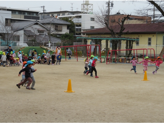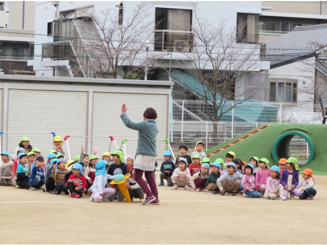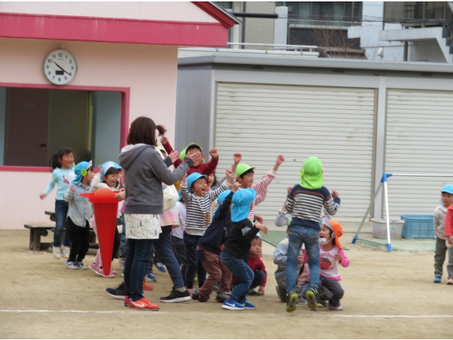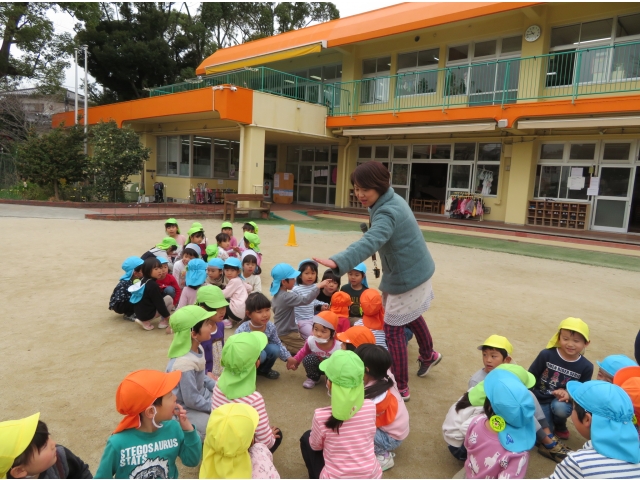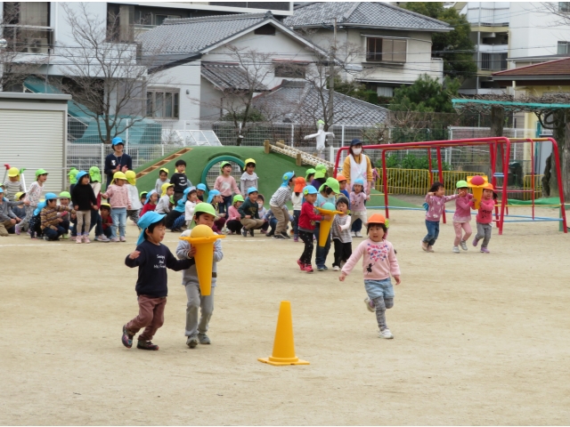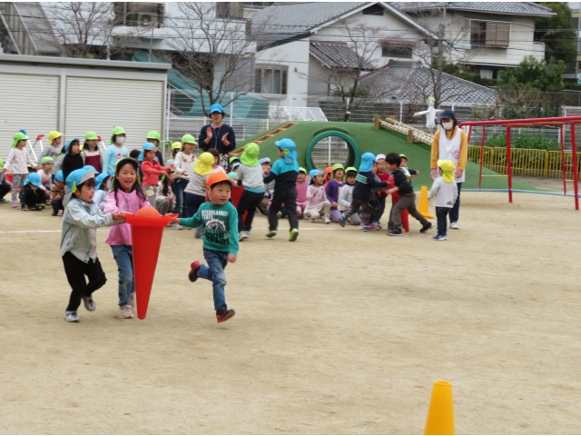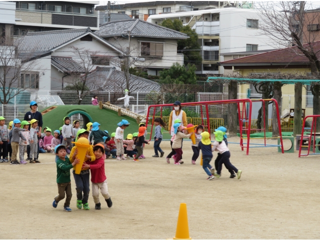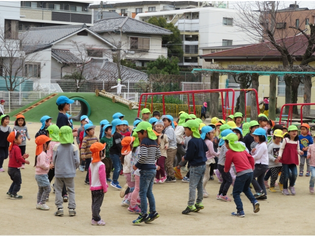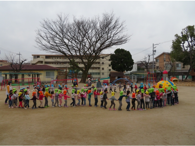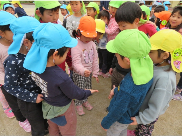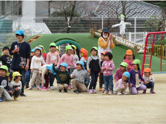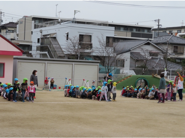 お弁当を持ってお別れ遠足へ行く予定でしたが、新型コロナウイルス対策のため内容を変更し、園内で3歳~5歳で“お楽しみ会”をして過ごしました。