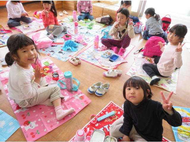 園庭で楽しく遊んだ後は、もう一つのお楽しみ“お弁当タイム♬”