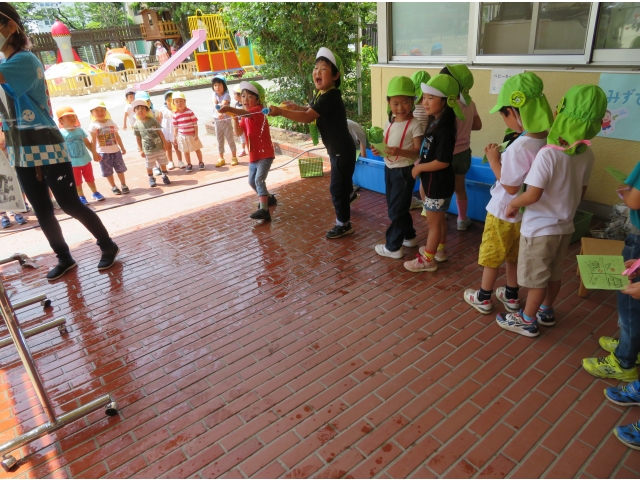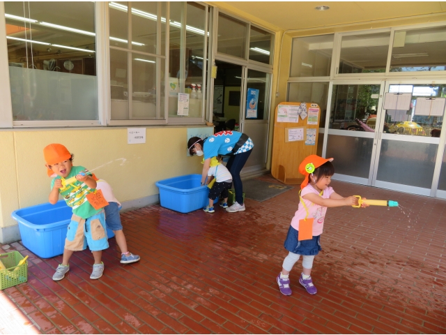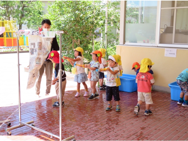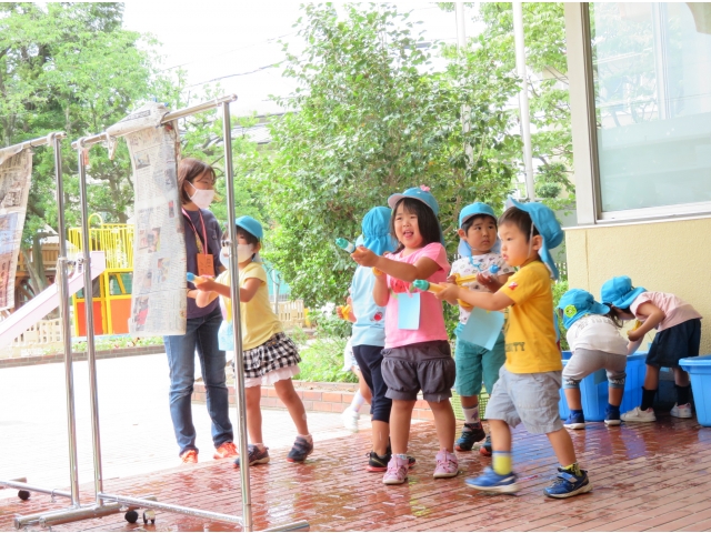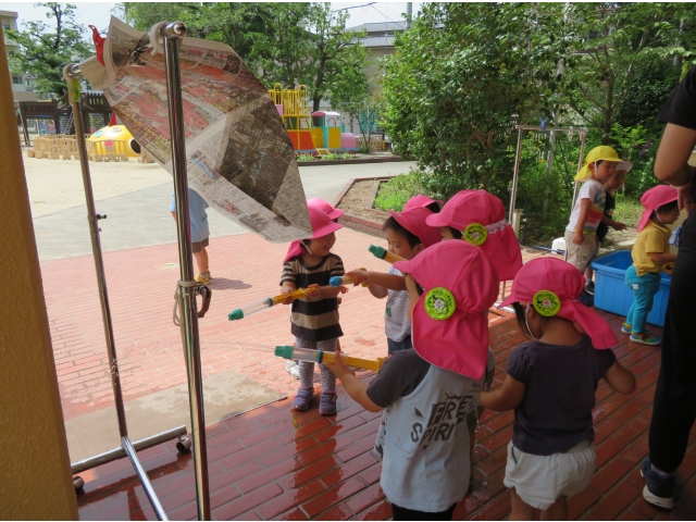 最後は、水鉄砲。新聞の的をねらいます!みんなびしょびしょです。