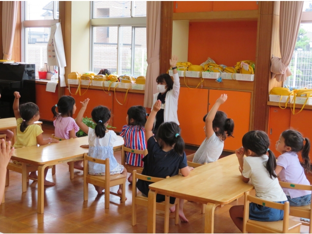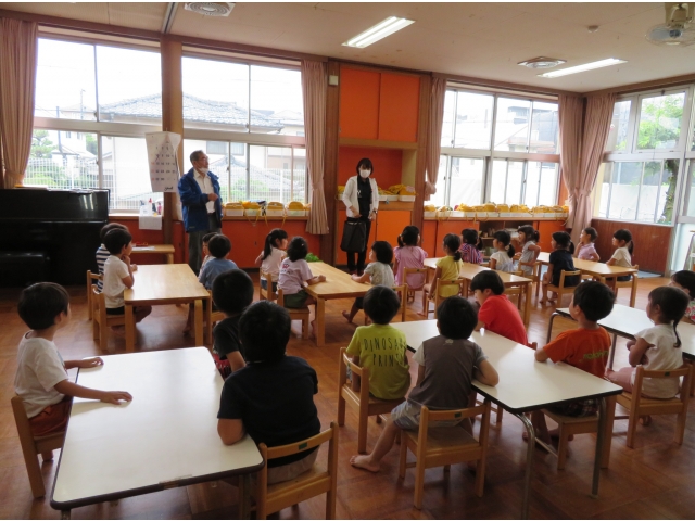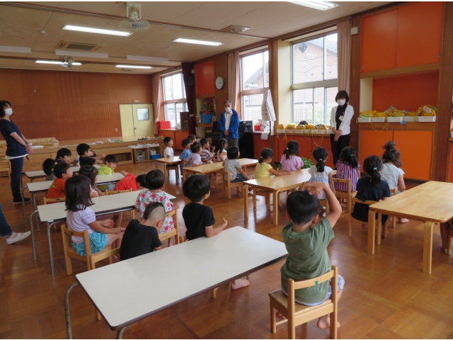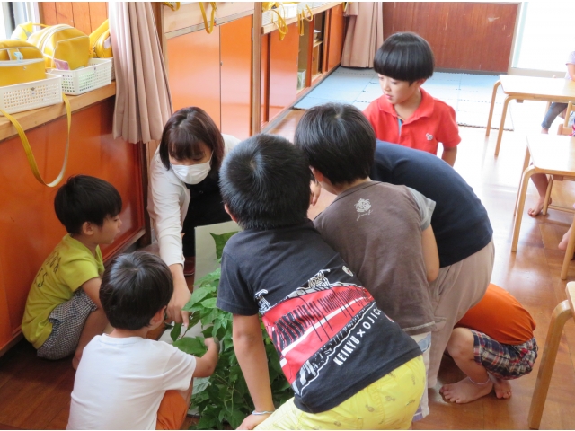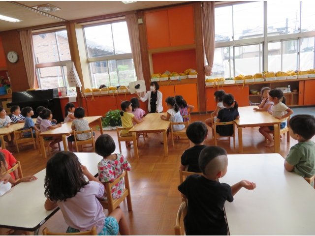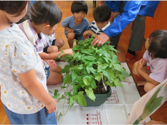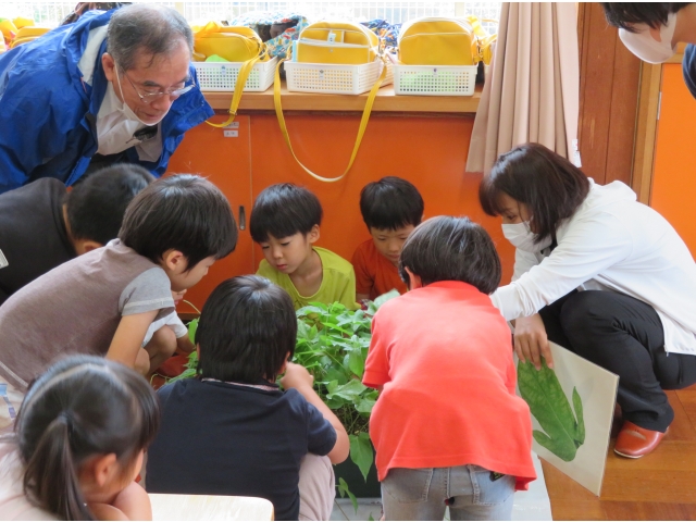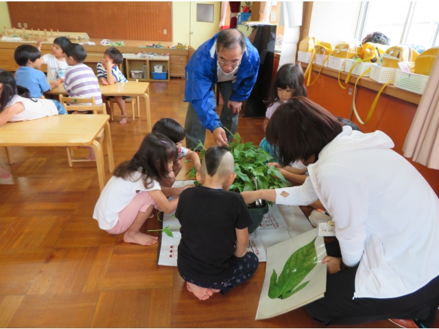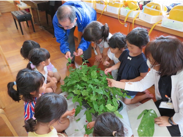 「空気をきれいにするためには、どうしたらいいんだろうね。保育園のアサガオの葉っぱも調べておいてね、次は8月の終わりごろお花が咲くころにきますね」と環境局の方がお話しされ、さようならをしました。