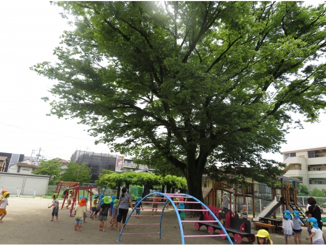 雨上がりの園庭で遊んでいたら、王様の木からセミの声が聞こえてきました。「どこ?どこ?」と見上げる子どもたち。