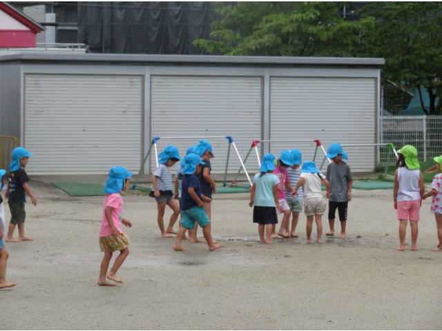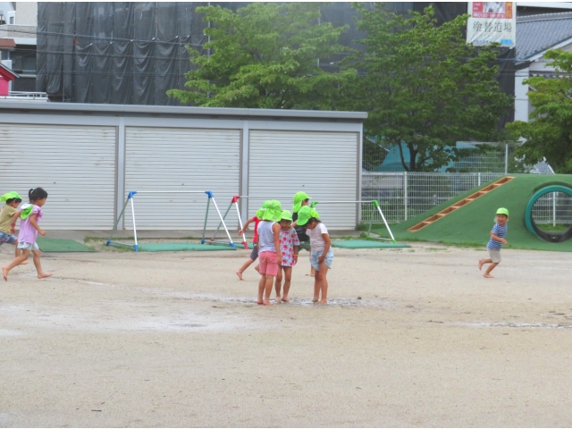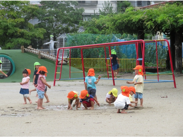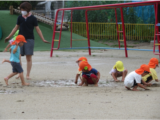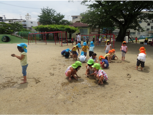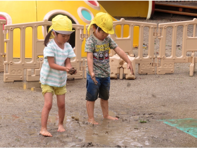 雨上がりの園庭では、幼児クラスの子どもたちが泥んこ遊びを始めました。