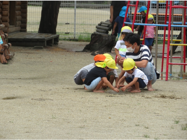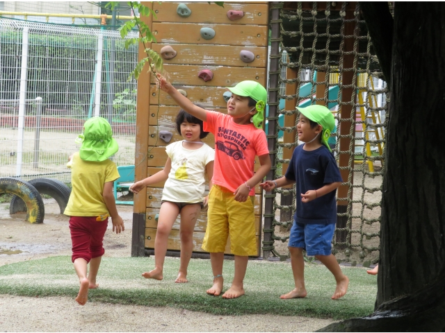 「あった~!」と大きな声が!見ると、手にセミの抜け殻を大事そうにのせていました。夏が来たのかな?