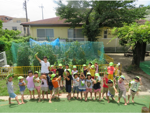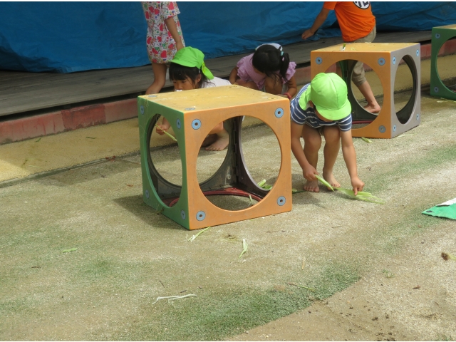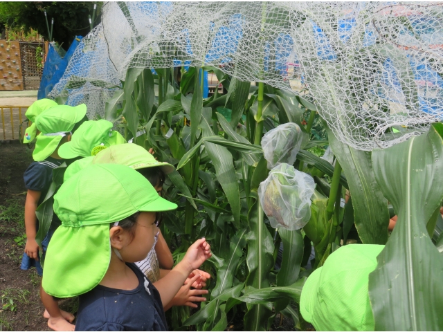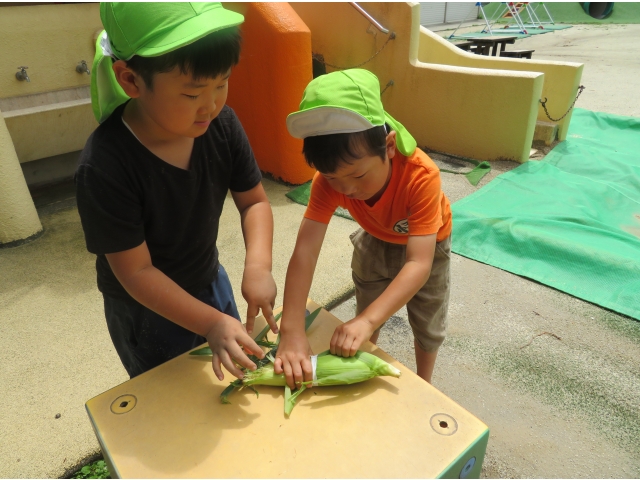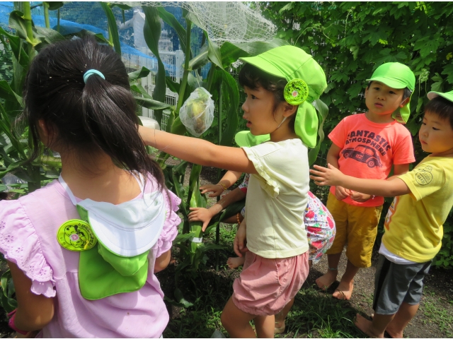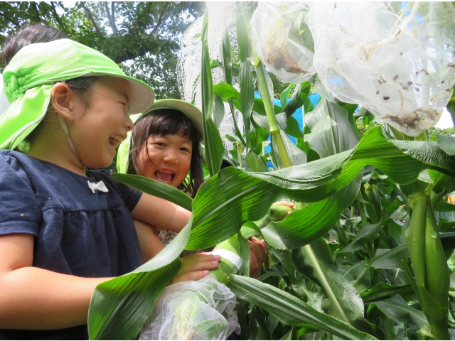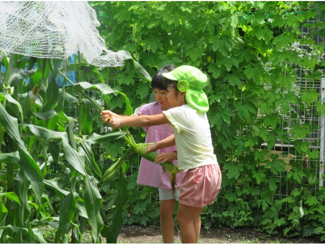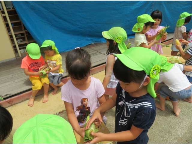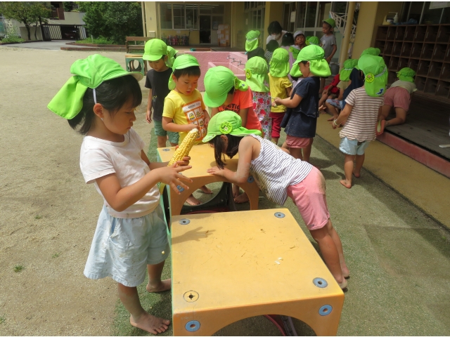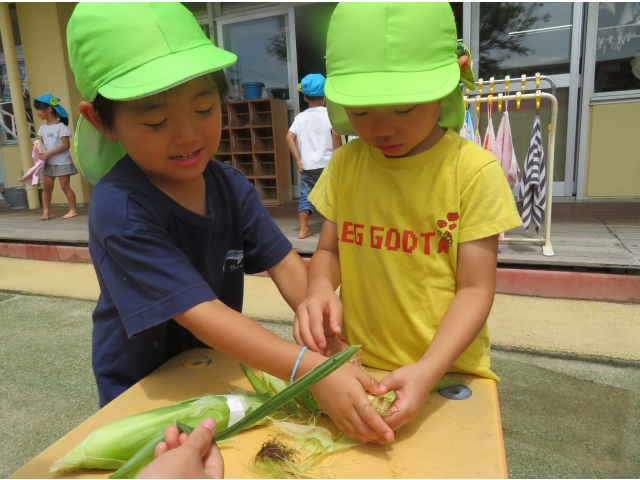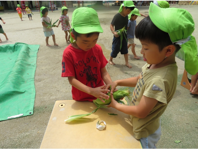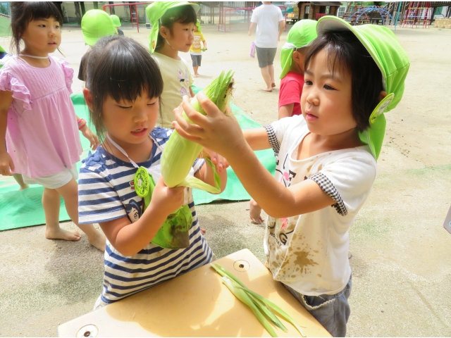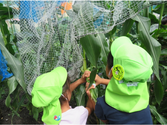 5歳児のぞう組さんが、畑で育てていたとうもろこしを収穫しました。2人で1本ずつとります。力を合わせて引っ張っていました。