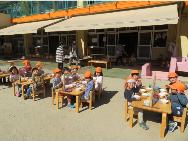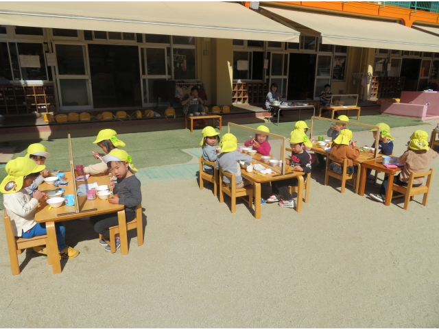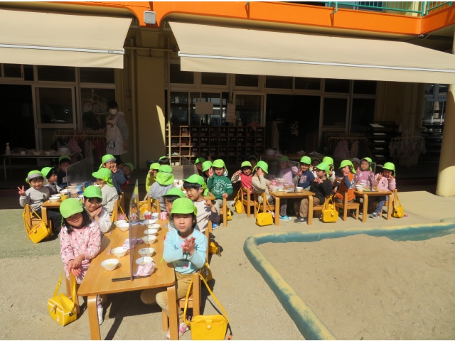 2月もあと少し。今日は、お日さまがいっぱいで暖かい日になりました。幼児クラスの子どもたちは、お外で給食を食べることにしました。