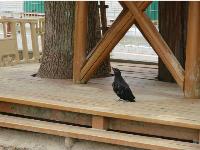 先日、からすの鳴き声が響き渡りました。その後、保育園の裏庭に赤ちゃんからすがいることを発見。まだ飛べないようで、ぴょこぴょこ歩いていました。