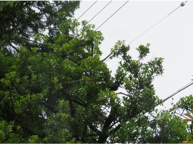 「せんせー、なんかいるよ」「うごかないよ」「はねがきれてるんじゃない?」と子どもたちがツリーハウスにいる赤ちゃんからすを発見!裏庭から園庭にぴょこぴょこ移動してきたようです。