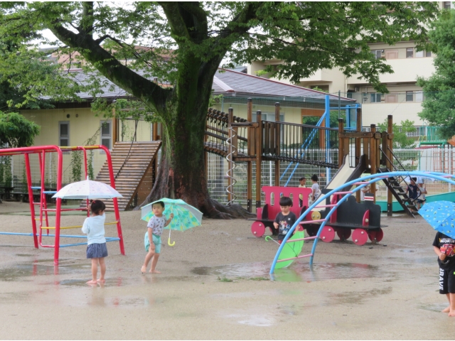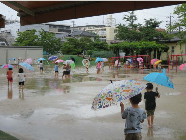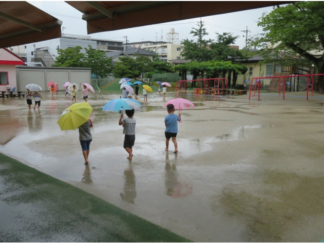 小雨になった頃を見計らい、自分の傘をさして裸足で園庭に出ていきました。