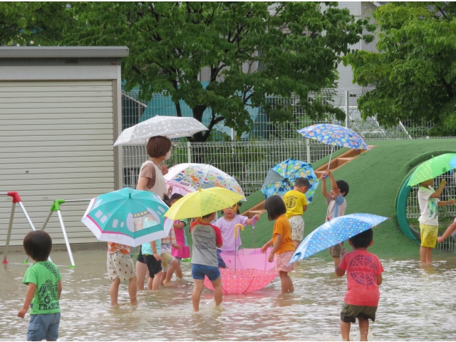 園庭には海みたいに水がたまったところがありました。裸足でジャブジャブ入っていきます。