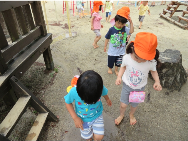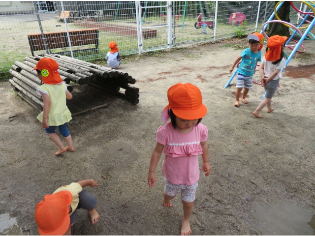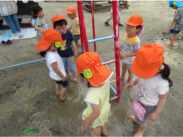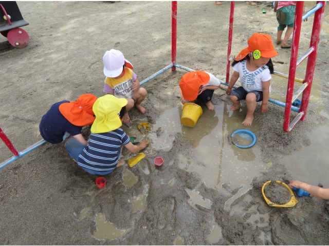 前日に雨がたくさん降り、園庭にはたくさんの水たまりができていました。 子どもたちは保育者が「泥んこ遊びするよ!」と声を掛けると大喜びで園庭に出ていきました。