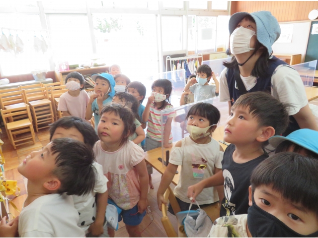 「どこから来たのかな」「おやつが食べたいのかな」どの子も興味津々で観察しています。
