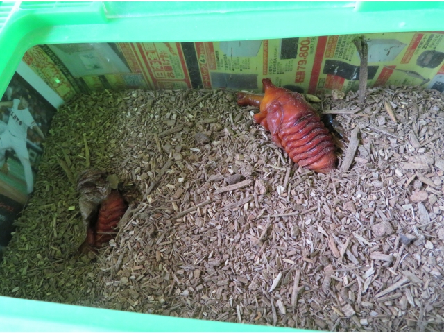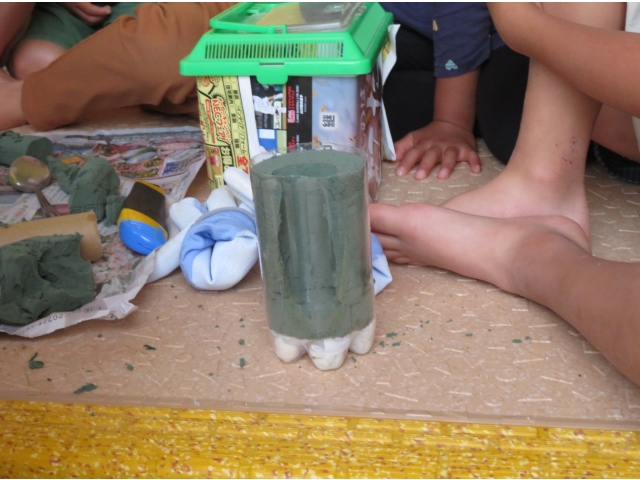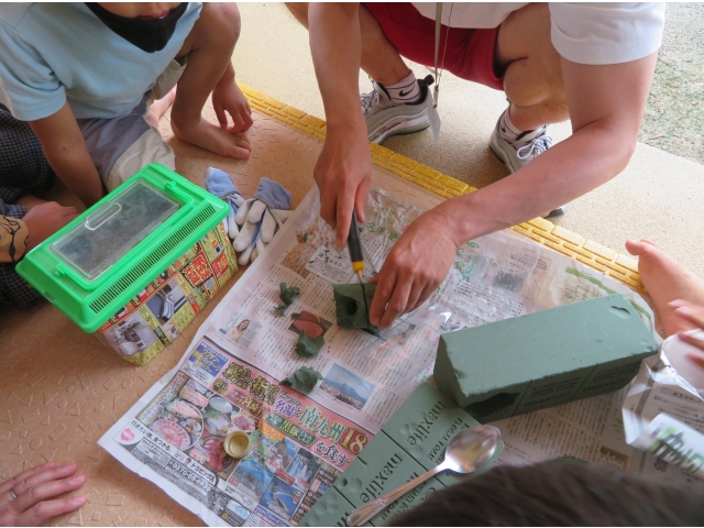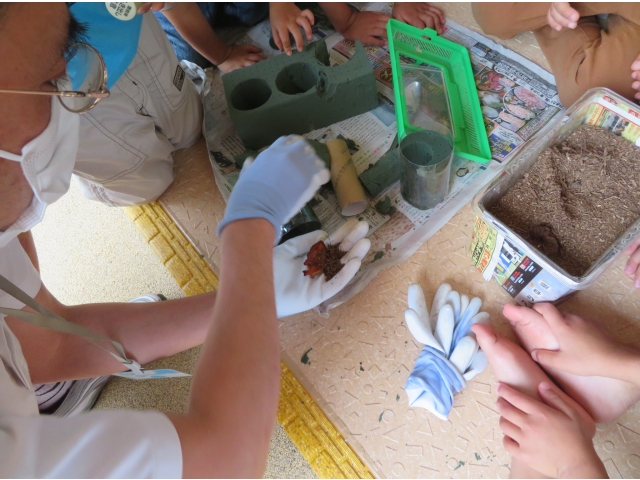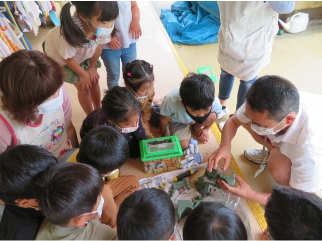 5歳児で育てていたカブトムシがさなぎになりました。でも飼育ケースの土が気に入らないのか、潜っていません。このままでは死んでしまうとのことで、虫に詳しい保護者の方にカブトムシのお家を作ってもらいました。