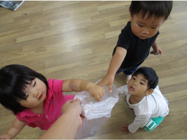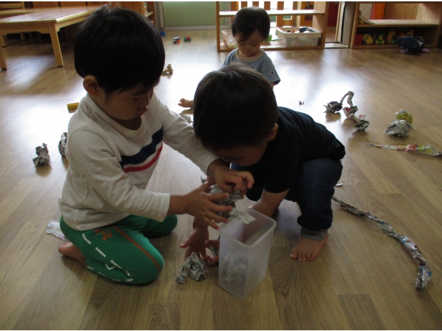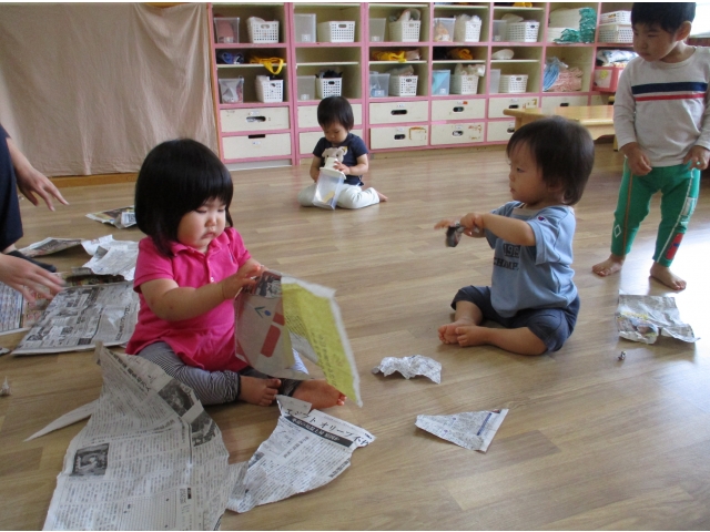雨の日に新聞紙あそびをしました。少し切り込みを入れて渡すと両手で端を持ってビリビリ~っとしたりくしゃくしゃした紙を投げたりして楽しんでました。