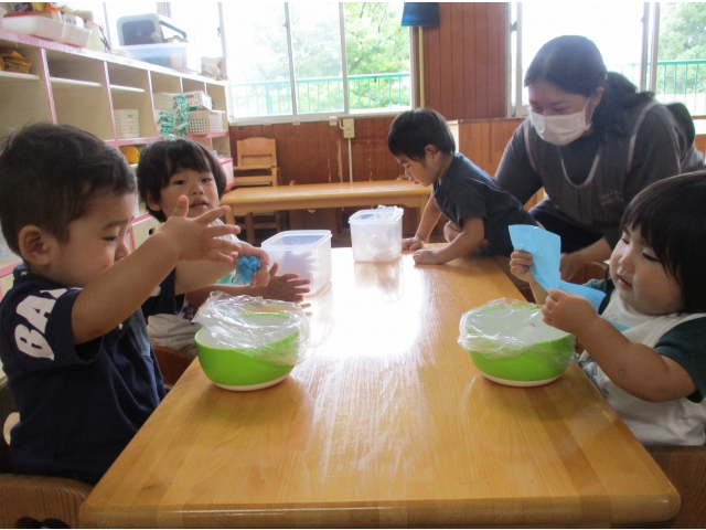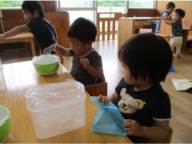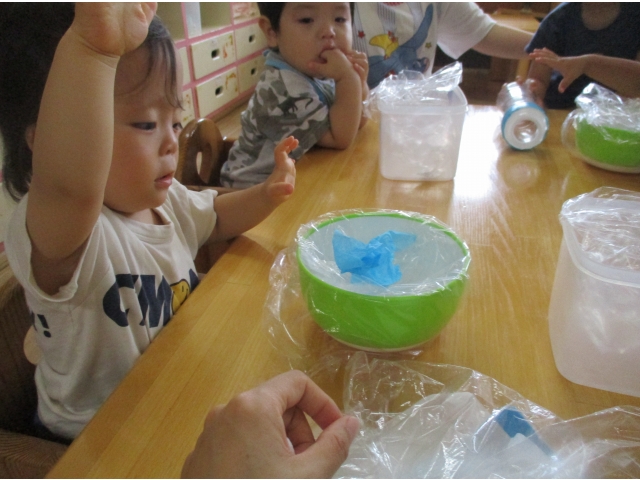数日後、お花紙をくしゃくしゃっとして袋にいれる七夕製作をしました。