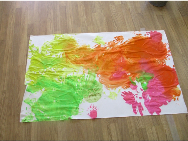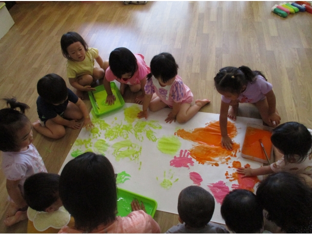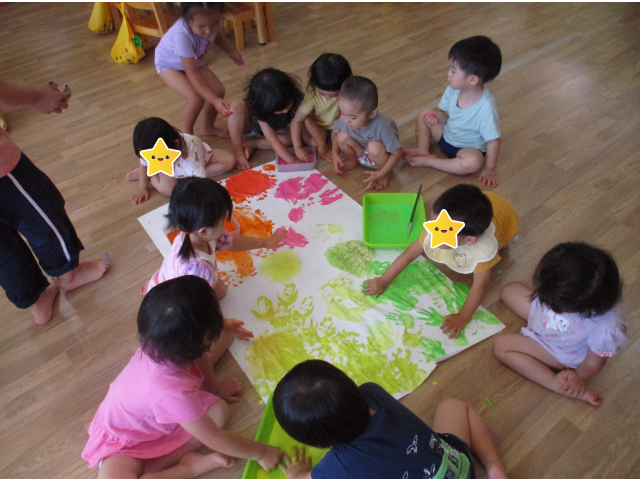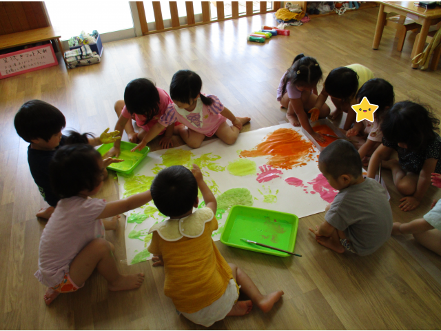 手で塗ったので、絵の具の感触を楽しんでいました。