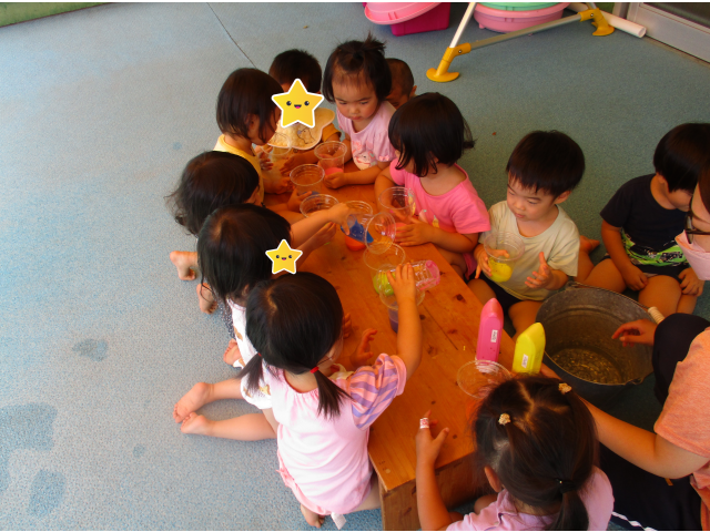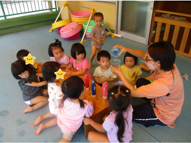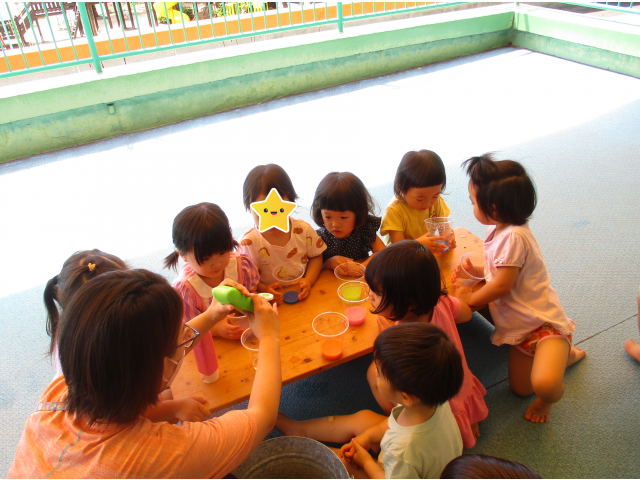 とても暑い日に、りす組さんのベランダを借りて色水遊びをしました。