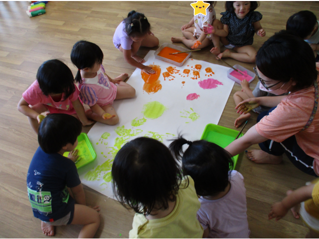 子どもたち一人ひとりが好きな色を選び、お友だち同士で混ぜ合う姿もありました。