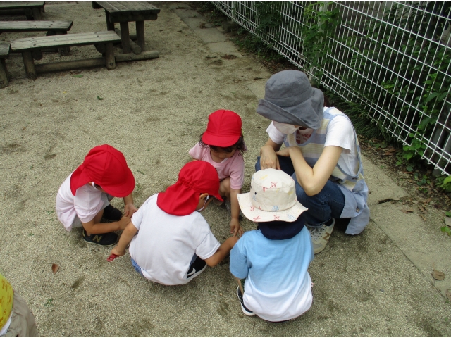 園庭の隅でダンゴムシとアリを探しています。何匹見つかったのかな?