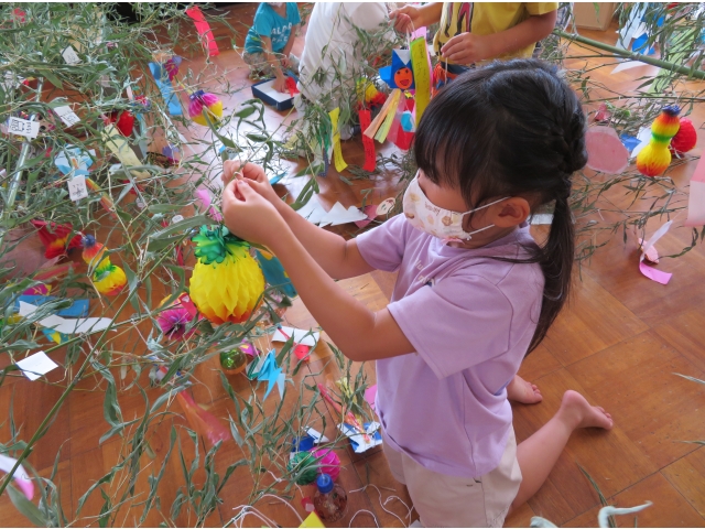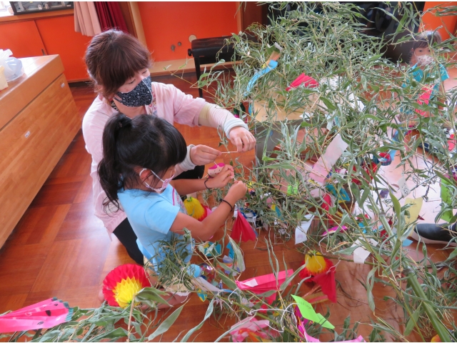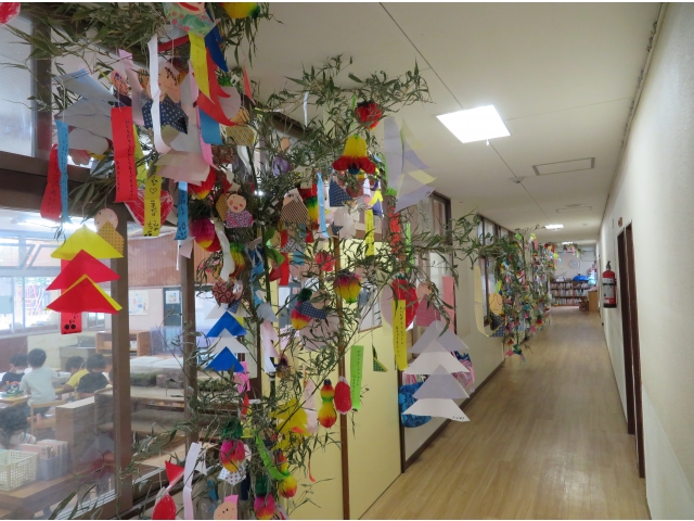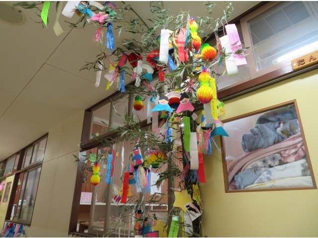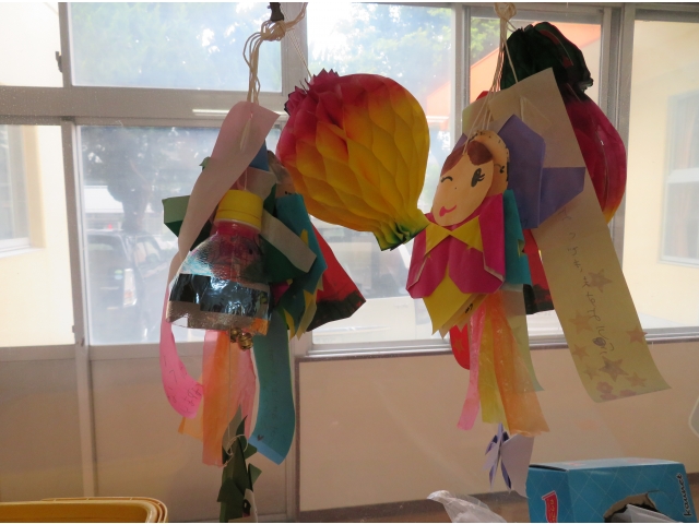 子どもたちが作った七夕飾りとお家の人と願い事を書いた短冊を笹に飾りつけました。