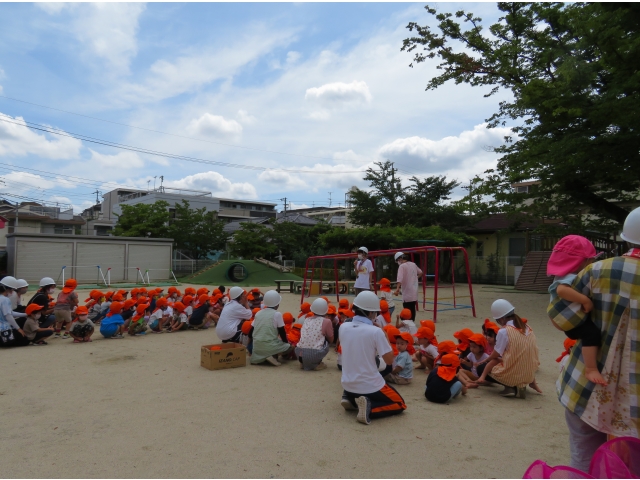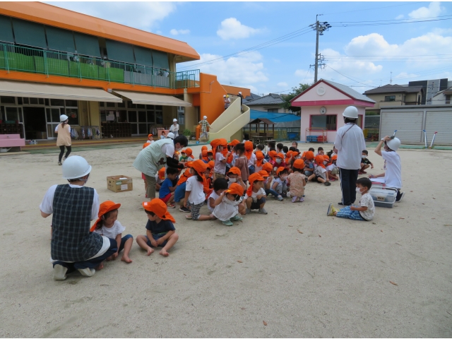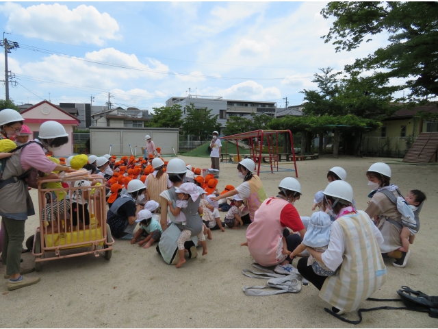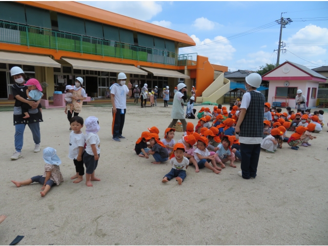 地震の時は、ダンゴムシのポーズになったり、机の下にもぐって大事な頭を守ることを確認しました。幼児さんは園庭への避難も、ヘルメットの帽子をかぶるのも素早くできました。乳児さんたちは不安そうな顔をしていましたが、泣かずに避難できました。子どもたちの命を守るため、職員も真剣に取り組んでいます。