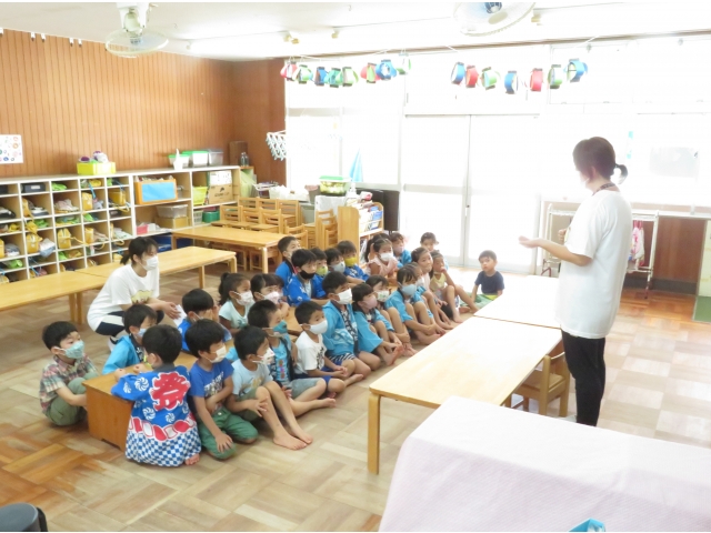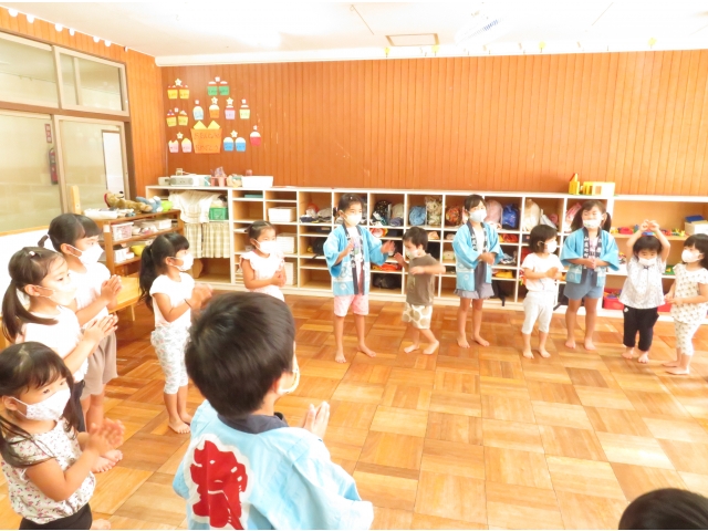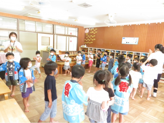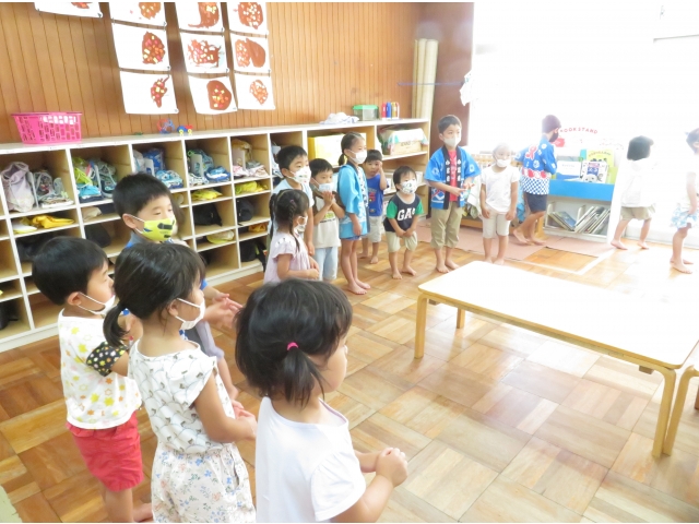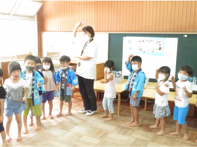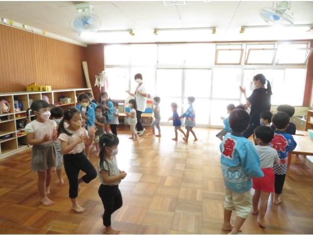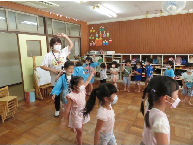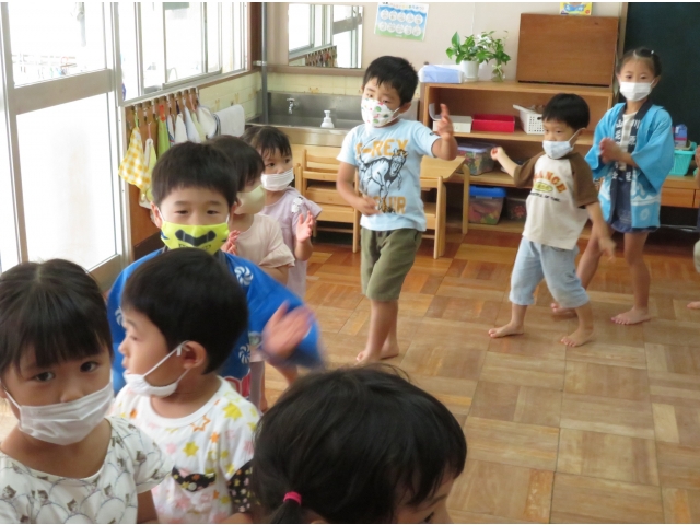 ぞう組のお友だちが3・4歳児のクラスに入り、リードしながらみんなで エビカニックス の曲に合わせてみんなで踊りました♪